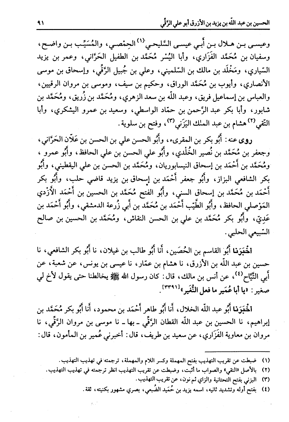 وعيسى بن هلال بن أبي عيسى السليحي (1) الحمصي والمسيب بن واضح وسفيان بن محمد الفزاري وأبا اليسر محمد بن الطفيل الحراني وعمر بن يزيد السياري ومخلد بن مالك بن السلميني وعلي بن جبيل الرقي وإسحاق بن موسى الأنصاري وأيوب بن محمد الوراق وحكيم بن سيف وموسى بن مروان الرقيين والعباس بن إسماعيل فريق وعبد الله بن سعد الزهري ومحمد بن زريق ومحمد بن شابور وأبا بكر عبد الرحمن بن حماد الواسطي وسعيد بن عمرو اليشكري وأبا التقي (2) هشام بن عبد الملك اليزني (3) وفتح بن سلوية روى عنه أبو بكر بن المقرئ وأبو الحسن علي بن الحسن بن علان الحراني وجعفر بن محمد بن نصير الخلدي وأبو علي الحسن بن علي الحافظ وأبو عمرو ومحمد بن أحمد بن إسحاق النيسابوريان ومحمد بن الحسن بن علي اليقطيني وأبو بكر الشافعي البزاز وأبو جعفر أحمد بن إسحاق بن يزيد قاضي حلب وأبو بكر أحمد بن محمد بن إسحاق السني وأبو الفتح محمد بن الحسين بن أحمد الأزدي الموصلي الحافظ وأبو الطيب أحمد بن محمد بن أبي زرعة الدمشقي وأبو أحمد بن عدي وأبو بكر محمد بن علي بن الحسن النقاش ومحمد بن الحسين بن صالح السبيعي الحلبي أخبرنا أبو القاسم بن الحصين أنا أبو طالب بن غيلان نا أبو بكر الشافعي نا حسين بن عبد الله بن الأزرق نا هشام بن عمار نا عيسى بن يونس عن شعبة عن أبي التياح (4) عن أنس بن مالك قال كان رسول الله (صلى الله عليه وسلم) يخالطنا حتى يقول لأخ لي صغير يا أبا عمير ما فعل النغير أخبرنا أبو عبد الله الخلال أنا أبو طاهر أحمد بن محمود أنا أبو بكر محمد بن إبراهيم نا الحسين بن عبد الله القطان الرقي بها نا موسى بن مروان الرقي نا مروان بن معاوية الفزاري عن سعيد بن طريف قال أخبرني عمير بن المأمون قال