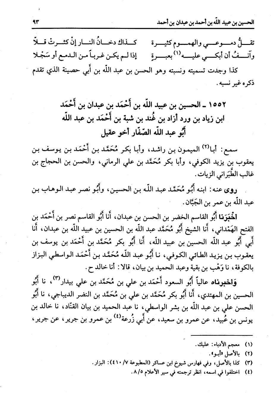 1552 - الحسين بن عبيد الله بن احمد بن عبدان بن أحمد بن زياد بن ورد أزاد بن غند بن شبة بن أحمد بن عبد الله أبو عبد الله الصفار أخو عقيل سمع أبا (2) الميمون بن راشد وأبا بكر محمد بن أحمد بن يوسف بن يعقوب بن يزيد الكوفي وأبا بكر محمد بن علي الرماني والحسن بن الحجاج بن غالب الطبراني الزيات روى عنه ابنه أبو محمد عبد الله بن الحسين وأبو نصر عبد الوهاب بن عبد الله بن عمر بن الجبان أخبرنا أبو القاسم الخضر بن الحسن بن عبدان أنا أبو القاسم نصر بن أحمد بن الفتح الهمذاني أنا الشيخ أبو محمد عبد الله بن الحسين بن عبيد الله بن عبدان أنا أبي أبو عبد الله الحسين بن عبيد الله أنا أبو بكر محمد بن أحمد بن يوسف بن يعقوب بن يزيد الطائي الكوفي نا أبو عبد الله محمد بن أحمد الواسطي البزاز بالكوفة نا وهب بن بقية وعبد الحميد بن بيان قالا أنا خالد ح وأخبرناه عاليا أبو السعود أحمد بن علي بن محمد بن علي بيدار (3) نا أبو الحسين بن المهتدي أنا أبو بكر محمد بن علي بن محمد بن النضر الديباجي نا أبو الحسن علي بن عبد الله بن بشر الواسطي نا عبد الحميد بن بيان القناد نا خالد بن يونس بن عبيد عن عمرو بن سعيد عن أبي زرعة (4) بن عمرو بن جرير عن جرير