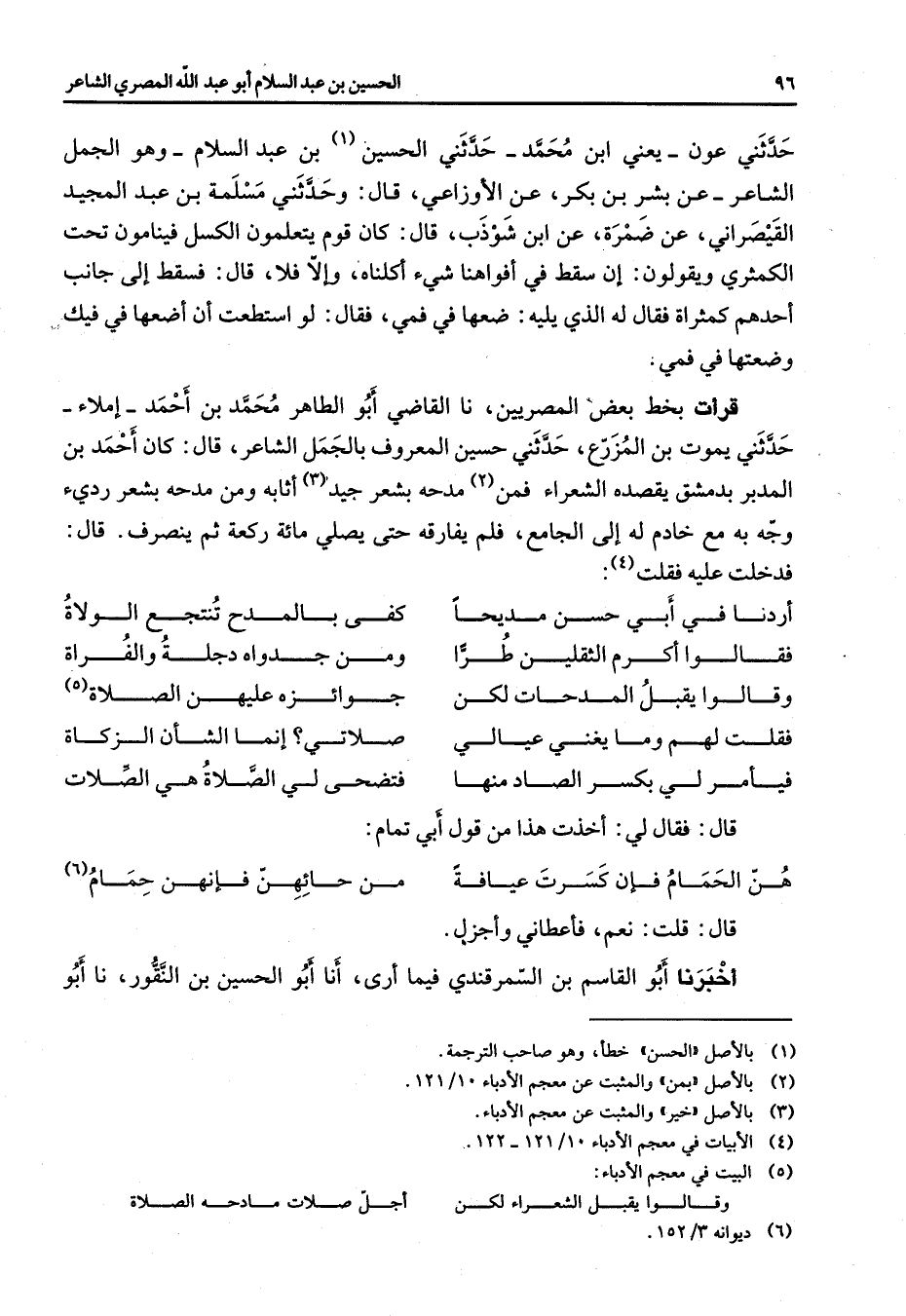 (5) البيت في معجم الادباء: وقالوا يقبل الشعراء لكن * أجل صلات مادحه الصلاة (6) ديوانه 3 / 152