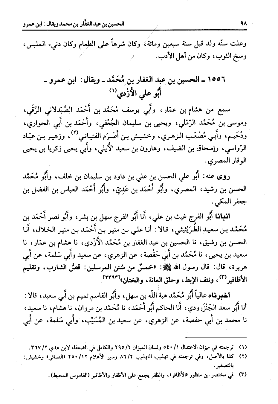 1556 - الحسين بن عبد الغفار بن محمد ويقال ابن عمرو أبو علي الأزدي (1) سمع من هشام بن عمار وأبي يوسف محمد بن أحمد الصيدلاني الرقي وموسى بن محمد الرملي ويحيى بن سليمان الجعفي وأحمد بن أبي الحواري ودحيم وأ 4 بي مصعب الزهري وخشيش بن أصرم الفتياني (2) وزهير بن عباد الرواسي وإسحاق بن الضيف وهارون بن سعيد الأيلي وأبي يحيى زكريا بن يحيى الوقار المصري روى عنه أبو علي الحسن بن علي بن داود بن سليمان بن خلف وأبو محمد الحسن بن رشيد المصري وأبو أحمد بن عدي وأبو أحمد العباس بن الفضل بن جعفر المكي أنبأنا أبو الفرج غيث بن علي أنا أبو الفرج سهل بن بشر وأبو نصر أحمد بن محمد بن سعيد الطربيشي قالا أنا علي بن منير بن أحمد بن منير الخلال أنا الحسن بن رشيق نا الحسين بن عبد الغفار بن محمد الأزدي نا هشام بن عمار نا سعيد بن يحيى نا محمد بن أبي حفصة عن الزهري عن سعيد وأبي سلمة عن أبي هريرة قال قال رسول الله (صلى الله عليه وسلم) خمس من سنن المرسلين قص الشارب وتقليم الأظافير (3) ونتف الإبط وحلق العانة والختان أخبرناه عاليا أبو محمد هبة الله بن سهل وأبو القاسم تميم بن أبي سعيد قالا أنا أبو سعد الجنزرودي أنا الحاكم أبو أحمد نا محمد بن مروان نا هشام نا سعيد نا محمد بن أبي حفصة عن الزهري عن سعيد بن المسيب وأبي سلمة عن أبي
