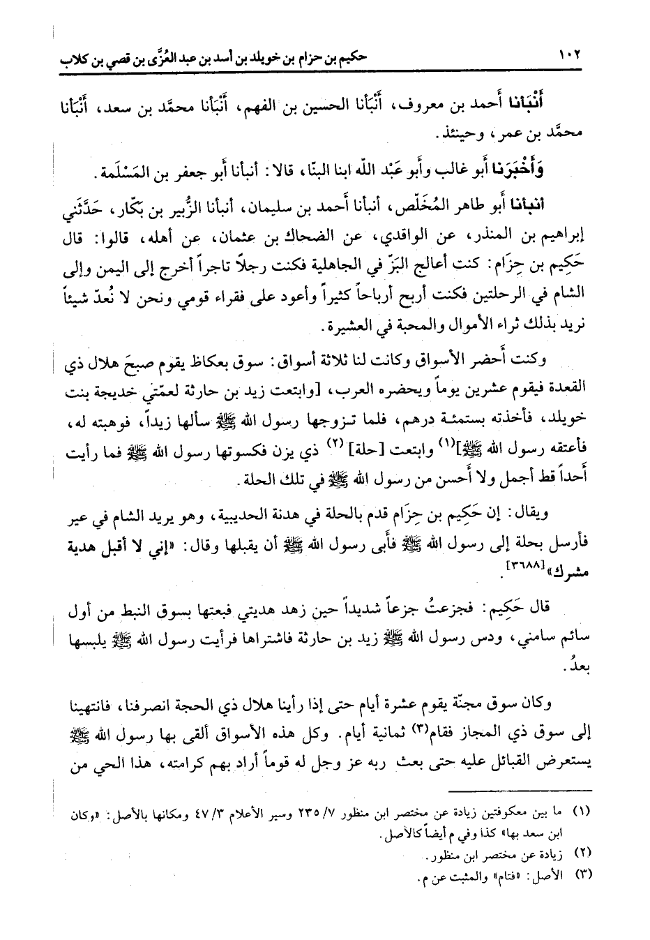 أنبأنا أحمد بن معروف أنبأنا الحسين بن الفهم أنبأنا محمد بن سعد أنبأنا محمد بن عمر وحينئذ وأخبرنا أبو غالب وأبو عبد الله ابنا البنا قالا أنبأنا أبو جعفر بن المسلمة أنبأنا أبو طاهر المخلص أنبأنا أحمد بن سليمان أنبأنا الزبير بن بكار حدثني إبراهيم بن المنذر عن الواقدي عن الضحاك بن عثمان عن أهله قالوا قال حكيم بن حزام كنت أعالج البز في الجاهلية فكنت رجلا تاجرا أخرج إلى اليمن وإلى الشام في الرحلتين فكنت أربح أرباحا كثيرا وأعود على فقراء قومي ونحن لا نعد شيئا نريد بذلك ثراء الأموال والمحبة في العشيرة وكنت أحضر الأسواق وكانت لنا ثلاثة أسواق سوق بعكاظ يقوم صبح هلال ذي العقدة فيقوم عشرين يوما ويحضره العرب وابتعت زيد بن حارثة لعمتي خديجة بنت خويلد فأخذته بستمئة درهم فلما تزوجها رسول الله (صلى الله عليه وسلم) سألها زيدا فوهبته له فأعتقه رسول الله (صلى الله عليه وسلم) (1) وابتعت (حلة) (2) ذي يزن فكسوتها رسول الله (صلى الله عليه وسلم) فما رأيت أحدا قط أجمل ولا أحسن من رسول الله (صلى الله عليه وسلم) في تلك الحلة ويقال إن حكيم بن حزام قدم بالحلة في هدنة الحديبية وهو يريد الشام في عير فأرسل بحلة إلى رسول الله (صلى الله عليه وسلم) فأبى رسول الله (صلى الله عليه وسلم) أن يقبلها وقال إني لا أقبل هدية مشرك (3688) قال حكيم فجزعت جزعا شديدا حين زهد هديتي فبعتها بسوق النبط من أول سائم سامني ودس رسول الله (صلى الله عليه وسلم) زيد بن حارثة فاشتراها فرأيت رسول الله (صلى الله عليه وسلم) يلبسها بعد وكان سوق مجنة يقوم عشرة أيام حتى إذا رأينا هلال ذي الحجة انصرفنا فانتهينا إلى سوق ذي المجاز فقام (3) ثمانية أيام وكل هذه الأسواق ألقى بها رسول الله (صلى الله عليه وسلم) يستعرض القبائل عليه حتى بعث ربه عز وجل له قوما أراد بهم كرامته هذا الحي من