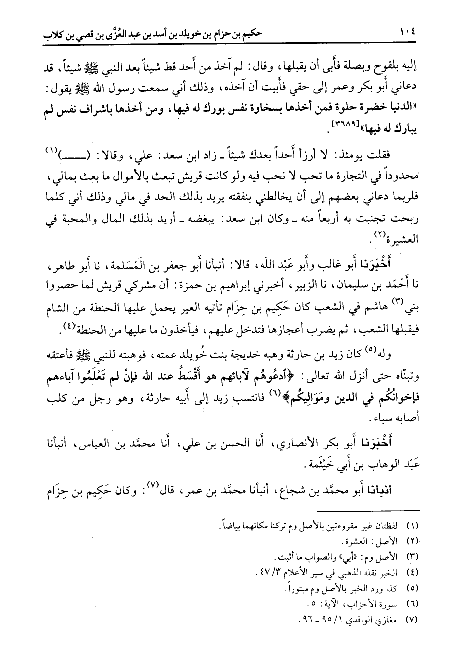 إليه بلقوح وبصلة فأبى أن يقبلها وقال لم آخذ من أحد قط شيئا بعد النبي (صلى الله عليه وسلم) شيئا قد دعاني أبو بكر وعمر إلى حقي فأبيت أن آخذه وذلك أني سمعت رسول الله (صلى الله عليه وسلم) يقول الدنيا خضرة حلوة فمن أخذها بسخاوة نفس بورك له فيها ومن أخذها بإشراف نفس لم يبارك له فيها (3689) فقلت يومئذ لا أرزأ أحدا بعدك شيئا زاد ابن سعد علي وقالا (1) محدودا في التجارة ما تحب لا نحب فيه ولو كانت قريش تبعث بالأموال ما بعث بمالي فلربما دعاني بعضهم إلى أن يخالطني بنفقته يريد بذلك الحد في مالي وذلك أني كلما ربحت تجنبت به أربعا منه وكان ابن سعد يبغضه أريد بذلك المال والمحبة في العشيرة (2) أخبرنا أبو غالب وأبو عبد الله قالا أنبأنا أبو جعفر بن المسلمة نا أبو طاهر نا أحمد بن سليمان نا الزبير أخبرني إبراهيم بن حمزة أن مشركي قريش لما حصروا بني (3) هاشم في الشعب كان حكيم بن حزام تأتيه العير يحمل عليها الحنطة من الشام فيقبلها الشعب ثم يضرب أعجازها فتدخل عليهم فيأخذون ما عليها من الحنطة (4) وله (5) كان زيد بن حارثة وهبه خديجة بنت خويلد عمته فوهبته للنبي (صلى الله عليه وسلم) فأعتقه وتبناه حتى أنزل الله تعالى " ادعوهم لآبائهم هو أقسط عند الله فإن لم تعلموا آباءهم فإخوانكم في الدين ومواليكم " (6) فانتسب زيد إلى أبيه حارثة وهو رجل من كلب أصابه سباء أخبرنا أبو بكر الأنصاري أنا الحسن بن علي أنا محمد بن العباس أنبأنا عبد الوهاب بن أبي خيمثة أنبأنا أبو محمد بن شجاع أنبأنا محمد بن عمر قال (7) وكان حكيم بن حزام