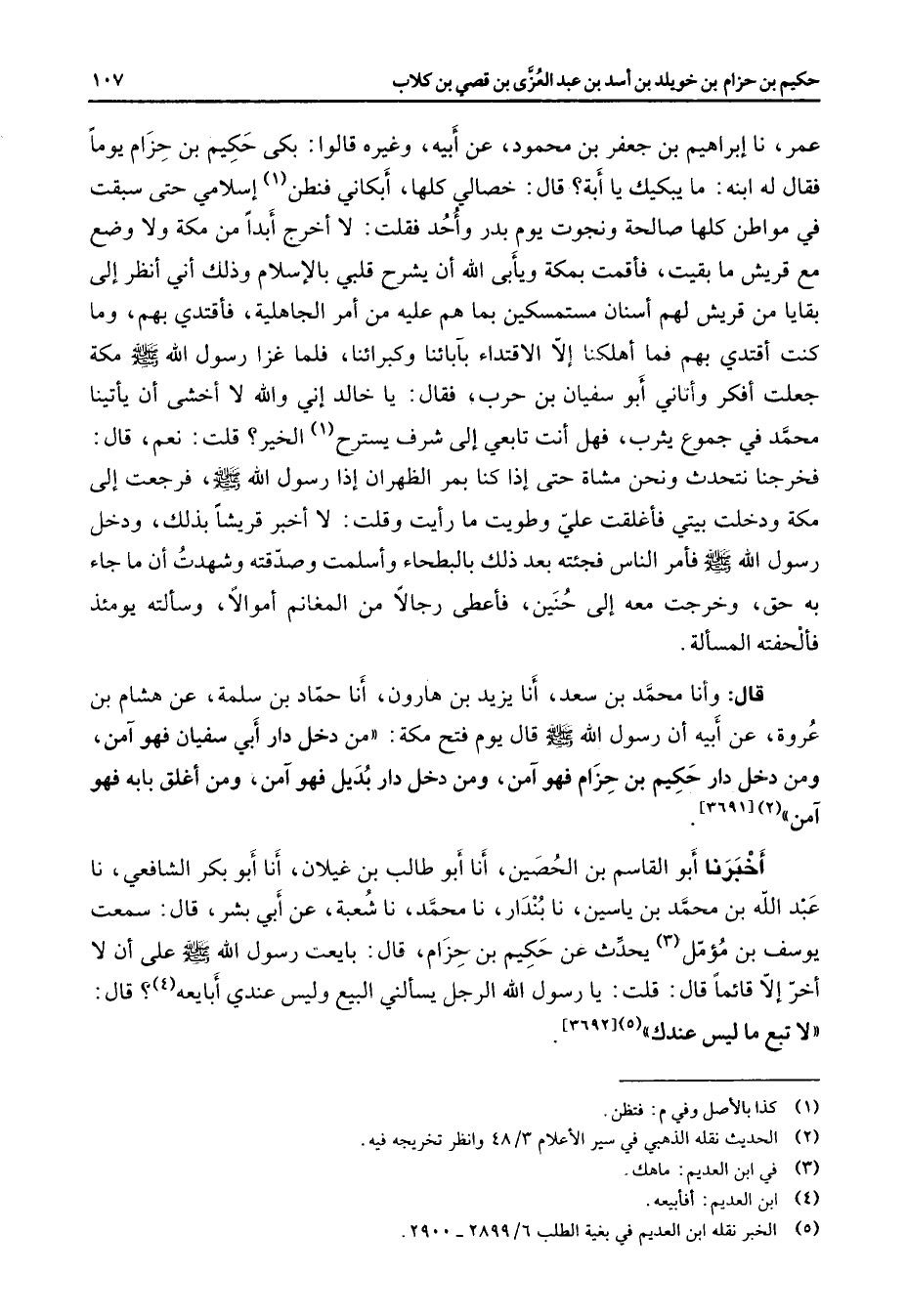 عمر نا إبراهيم بن جعفر بن محمود عن أبيه وغيره قالوا بكى حكيم بن حزام يوما فقال له ابنه ما يبكيك يا أبة قال خصالي كلها أبكاني فنطن (1) إسلامي حتى سبقت في مواطن كلها صالحة ونجوت يوم بدر وأحد فقلت لا أخرج أبدا من مكة ولا وضع مع قريش ما بقيت فأقمت بمكة ويأبى الله أن يشرح قلبي بالإسلام وذلك أني أنظر إلى بقايا من قريش لهم أسنان مستمسكين بما هم عليه من أمر الجاهلية فأقتدي بهم وما كنت أقتدي بهم فما أهلكنا إلا الاقتداء بآبائنا وكبرائنا فلما غزا رسول الله (صلى الله عليه وسلم) مكة جعلت أفكر وأتاني أبو سفيان بن حرب فقال يا خالد إني والله لا أخشى أن يأتينا محمد في جموع يثرب فهل أنت تابعي إلى شرف يسترح (1) الخير قلت نعم قال فخرجنا نتحدث ونحن مشاة حتى إذا كنا بمر الظهران إذا رسول الله (صلى الله عليه وسلم) فرجعت إلى مكة ودخلت بيتي فأغلقت علي وطويت ما رأيت وقلت لا أخبر قريشا بذلك ودخل رسول الله (صلى الله عليه وسلم) فأمر الناس فجئته بعد ذلك بالبطحاء وأسلمت وصدقته وشهدت أن ما جاء به حق وخرجت معه إلى حنين فأعطى رجالا من المغانم أموالا وسألته يومئذ فألحفته المسألة قال وأنا محمد بن سعد أنا يزيد بن هارون أنا حماد بن سلمة عن هشام بن عروة عن أبيه أن رسول الله (صلى الله عليه وسلم) قال يوم فتح مكة من دخل دار أبي سفيان فهو آمن ومن دخل دار حكيم بن حزام فهو آمن ومن دخل دار بديل فهو آمن ومن أغلق بابه فهو آمن (2) (3691) أخبرنا أبو القاسم بن الحصين أنا أبو طالب بن غيلان أنا أبو بكر الشافعي نا عبد الله بن محمد بن ياسين نا بندار نا محمد نا شعبة عن أبي بشر قال سمعت يوسف بن مؤمل (3) يحدث عن حكيم بن حزام قال بايعت رسول الله (صلى الله عليه وسلم) على أن لا أخر إلا قائما قال قلت يا رسول الله الرجل يسألني البيع وليس عندي أبايعه (4) قال لا تبع ما ليس عندك (5) (3692)