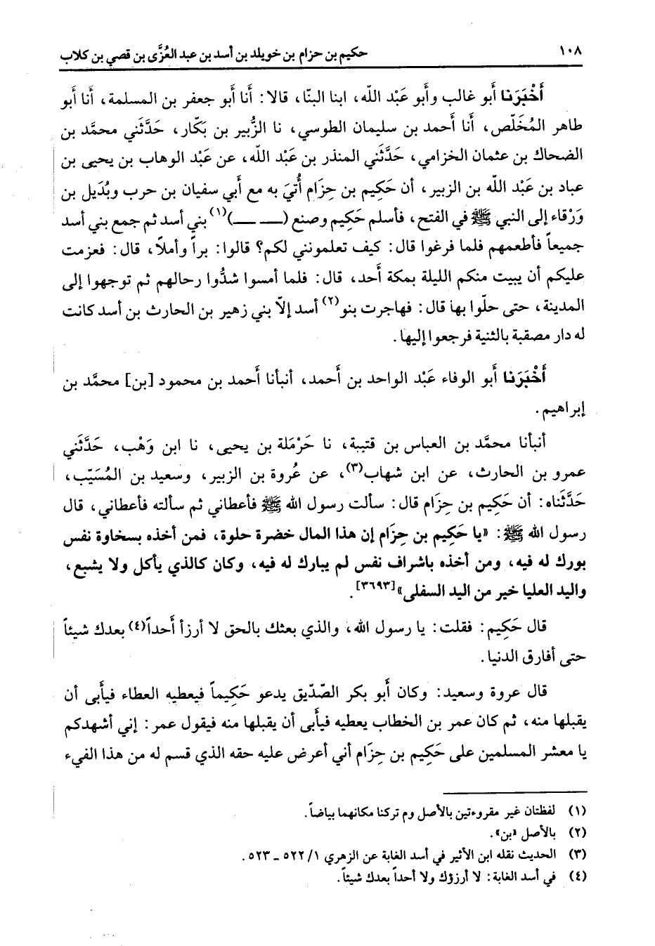 أخبرنا أبو غالب وأبو عبد الله ابنا البنا قالا أنا أبو جعفر بن المسلمة أنا أبو طاهر المخلص أنا أحمد بن سليمان الطوسي نا الزبير بن بكار حدثني محمد بن الضحاك بن عثمان الخزامي حدثني المنذر بن عبد الله عن عبد الوهاب بن يحيى بن عباد بن عبد الله بن الزبير أن حكيم بن حزام أتي به مع أبي سفيان بن حرب وبديل بن ورقاء إلى النبي (صلى الله عليه وسلم) في الفتح فأسلم حكيم وصنع (1) بني أسد ثم جمع بني أسد جميعا فأطعمهم فلما فرغوا قال كيف تعلمونني لكم قالوا برا وأملا قال فعزمت عليكم أن يبيت منكم الليلة بمكة أحد قال فلما أمسوا شدوا رحالهم ثم توجهوا إلى المدينة حتى حلوا بها قال فهاجرت بنو (2) أسد إلا بني زهير بن الحارث بن أسد كانت له دار مصقبة بالثنية فرجعوا إليها أخبرنا أبو الوفاء عبد الواحد بن أحمد أنبأنا أحمد بن محمود بن محمد بن إبراهيم أنبأنا محمد بن العباس بن قتيبة نا حرملة بن يحيى نا ابن وهب حدثني عمرو بن الحارث عن ابن شهاب (3) عن عروة بن الزبير وسعيد بن المسيب حدثناه أن حكيم بن حزام قال سألت رسول الله (صلى الله عليه وسلم) فأعطاني ثم سألته فأعطاني قال رسول الله (صلى الله عليه وسلم) يا حكيم بن حزام إن هذا المال خضرة حلوة فمن أخذه بسخاوة نفس بورك له فيه ومن أخذه بإشراف نفس لم يبارك له فيه وكان كالذي يأكل ولا يشبع واليد العليا خير من اليد السفلى (3693) قال حكيم فقلت يا رسول الله والذي بعثك بالحق لا أرزأ أحد (4) بعدك شيئا حتى أفارق الدنيا قال عروة وسعيد وكان أبو بكر الصديق يدعو حكيما فيعطيه العطاء فيأبى أن يقبلها منه ثم كان عمر بن الخطاب يعطيه فيأبى أن يقبلها منه فيقول عمر إني أشهدكم يا معشر المسلمين على حكيم بن حزام أني أعرض عليه حقه الذي قسم له من هذا الفئ