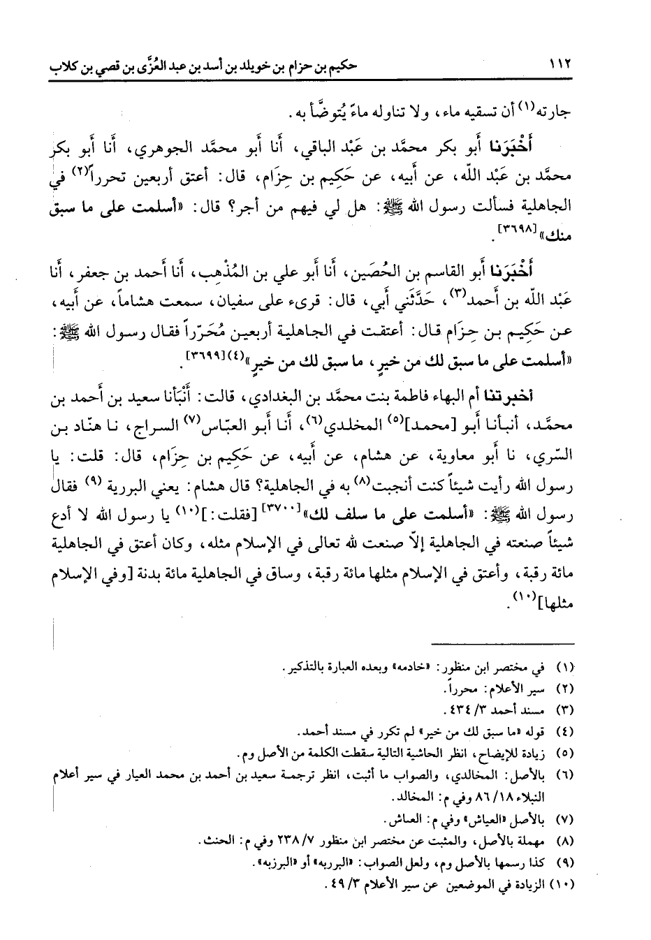 جارته (1) أن تسقيه ماء ولا تناوله ماء يتوضأ به أخبرنا أبو بكر محمد بن عبد الباقي أنا أبو محمد الجوهري أنا أبو بكر محمد بن عبد الله عن أبيه عن حكيم بن حزام قال أعتق أربعين تحررا (2) في الجاهلية فسألت رسول الله (صلى الله عليه وسلم) هل لي فيهم من أجر قال أسلمت على ما سبق منك (3698) أخبرنا أبو القاسم بن الحصين أنا أبو علي بن المذهب أنا أحمد بن جعفر أنا عبد الله بن أحمد (3) حدثني أبي قال قرئ على سفيان سمعت هشاما عن أبيه عن حكيم بن حزام قال أعتقت في الجاهلية أربعين محررا فقال رسول الله (صلى الله عليه وسلم) أسلمت على ما سبق لك من خير ما سبق لك من خير (4) (3699) أخبرتنا أم البهاء فاطمة بنت محمد بن البغدادي قالت أنبأنا سعيد بن أحمد بن محمد أنبأنا أبو محمد (5) المخلدي (6) أنا أبو العباس (7) السراج نا هناد بن السري نا أبو معاوية عن هشام عن أبيه عن حكيم بن حزام قال قلت يا رسول الله رأيت شيئا كنت أنجبت (8) به في الجاهلية قال هشام يعني البررية (9) فقال رسول الله (صلى الله عليه وسلم) أسلمت على ما سلف لك (3700) فقلت (10) يا رسول الله لا أدع شيئا صنعته في الجاهلية إلا صنعت لله تعالى في الإسلام مثله وكان أعتق في الجاهلية مائة رقبة وأعتق في الإسلام مثلها مائة رقبة وساق في الجاهلية مائة بدنة وفي الإسلام مثلها (10)