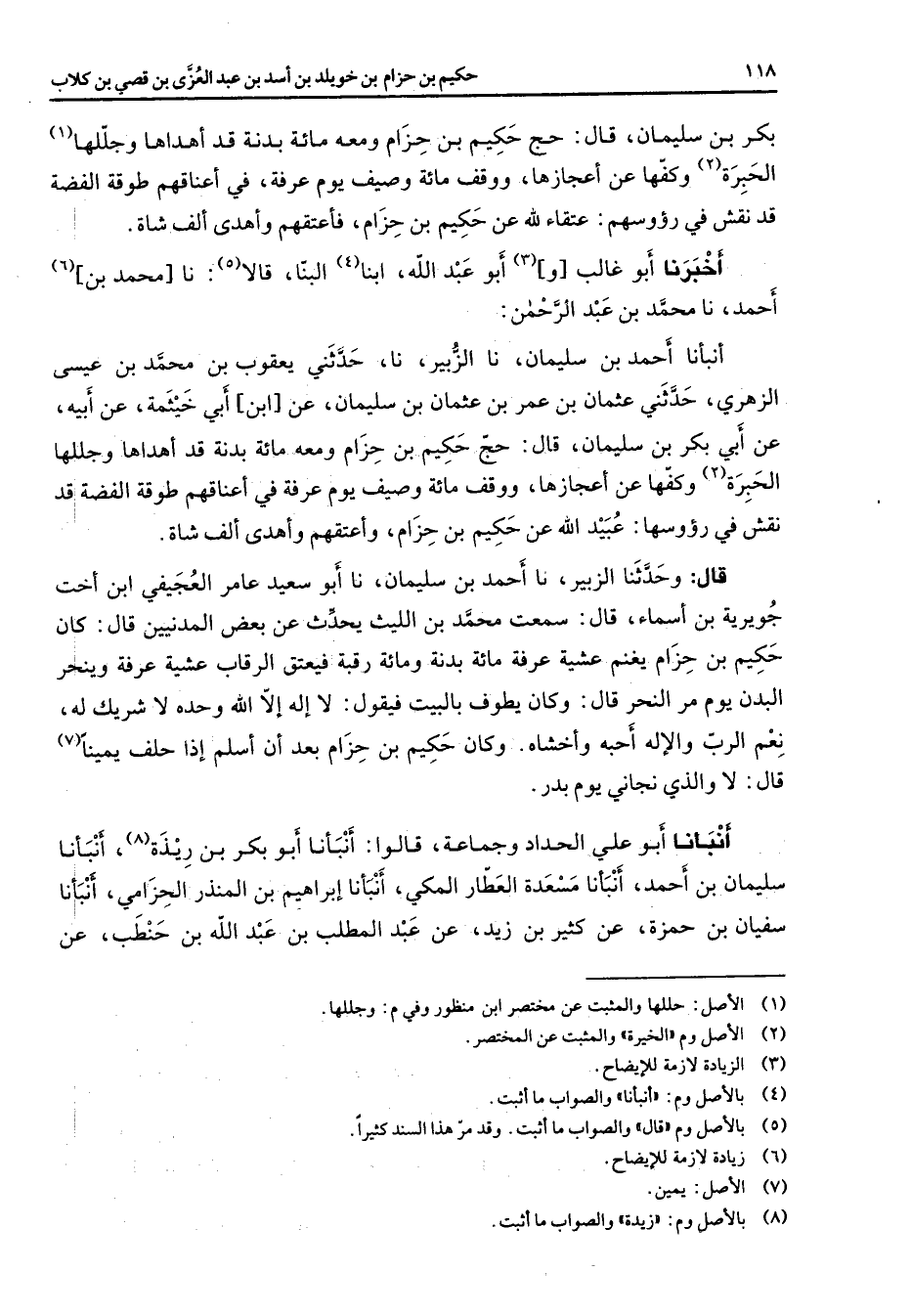 بكر بن سليمان قال حج حكيم بن حزام ومعه مائة بدنة قد أهداها وجللها (1) الحبرة (2) وكفها عن أعجازها ووقف مائة وصيف يوم عرفة في أعناقهم طوقة الفضة قد نقش في رؤوسهم عتقاء لله عن حكيم بن حزام فأعتقهم وأهدى ألف شاة أخبرنا أبو غالب و (3) أبو عبد الله ابنا (4) البنا قالا (5) نا محمد بن (6) أحمد نا محمد بن عبد الرحمن أنبأنا أحمد بن سليمان نا الزبير نا حدثني يعقوب بن محمد بن عيسى الزهري حدثني عثمان بن عمر بن عثمان بن سليمان عن ابن أبي خيثمة عن أبيه عن أبي بكر بن سليمان قال حج حكيم بن حزام ومعه مائة بدنه قد أهداها وجللها الحبرة (2) وكفها عن أعجازها ووقف مائة وصيف يوم عرفة في أعناقهم طوقة الفضة قد نقش في رؤوسها عبيد الله عنحكيم بن حزام وأعتقهم وأهدى ألف شاة قال وحدثنا الزبير نا أحمد بن سليمان نا أبو سعيد عامر العجيفي ابن أخت جويرية بن أسماء قال سمعت محمد بن الليث يحدث عن بعض المدنيين قال كان حكيم بن حزام يغنم عشية عرفة مائة بدنة ومائة رقبة فيعتق الرقاب عشية عرفة وينحر البدن يوم مر النحر قال وكان يطوف بالبيت فيقول لا إله إلا الله وحده لا شريك له نعم الرب والإله أحبه وأخشاه وكان حكيم بن حزام بعد أن أسلم إذا حلف يمينا (7) قال لا والذي نجاني يوم بدر أنبأنا أبو علي الحداد وجماعة قالوا أنبأنا أبو بكر بن ريذة (1) أنبأنا سليمان بن أحمد أنبأنا مسعدة العطار المكي أنبأنا إبراهيم بن المنذر الحزامي أنبأنا سفيان بن حمزة عن كثير بن زيد عن عبد المطلب بن عبد الله بن حنطب عن