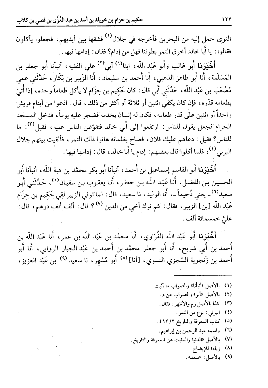 النوى حمل إليه من البحرين فأخرجه في جلال فشقها بين أيديهم فجعلوا يأكلون فقالوا يا أبا خالد أخرق التمر بطوننا فهل من إدام فقال إدامها فيها أخبرنا أبو غالب وأبو عبد الله ابنا (1) أبي (2) علي الفقيه أنبأنا أبو جعفر بن المسلمة أنا أبو طاهر الذهبي أنا أحمد بن سليمان أنا الزبير بن بكار حدثني عمي مصعب بن عبد الله حدثني أبي قال كان حكيم بن حزام لا يأكل طعاما وحده إذا أتي بطعامه قدره فإن كان يكفي اثنين أو ثلاثة أو أكثر من ذلك قال ادعوا من أيتام قريش واحدا أو اثنين على قدر طعامه فكان له إنسان يخدمه فضجر عليه يوما فدخل المسجد الحرام فجعل يقول في للناس ارتفعوا إلى أبي خالد فتقوض الناس عليه فقيل (3) ما للناس فقيل دعاهم عليك فلان فصاح بغلمانه هاتوا ذلك التمر فألقيت بينهم جلال البرني (4) فلما أكلوا قال بعضهم إدام يا أبا خالد إدامها فيها أخبرنا أبو القاسم إسماعيل بن أحمد أنبأنا أبو بكر محمد بن هبة الله أنبأنا أبو الحسين بن الفضل أنا عبد الله بن جعفر أنا يعقوب بن سفيان (5) حدثني أبو سعيد (6) يعني دحيما أنا الوليد نا سعيد قال لما توفي الزبير لقي حكيم بن حزام عبد الله بن الزبير فقال كم ترك أخي من الدين (7) قال ألف ألف درهم قال علي خمسمائة ألف أخبرنا أبو عبد الله الفراوي أنا محمد بن عبد الله بن عمر أنا عبد الله بن أحمد بن أبي شريح أنا أبو جعفر محمد بن أحمد بن عبد الجبار الروابي أنا أبو أحمد بن زنجوية السجزي النسوي أنا (8) أبو مسهر نا سعيد (9) بن عبد العزيز