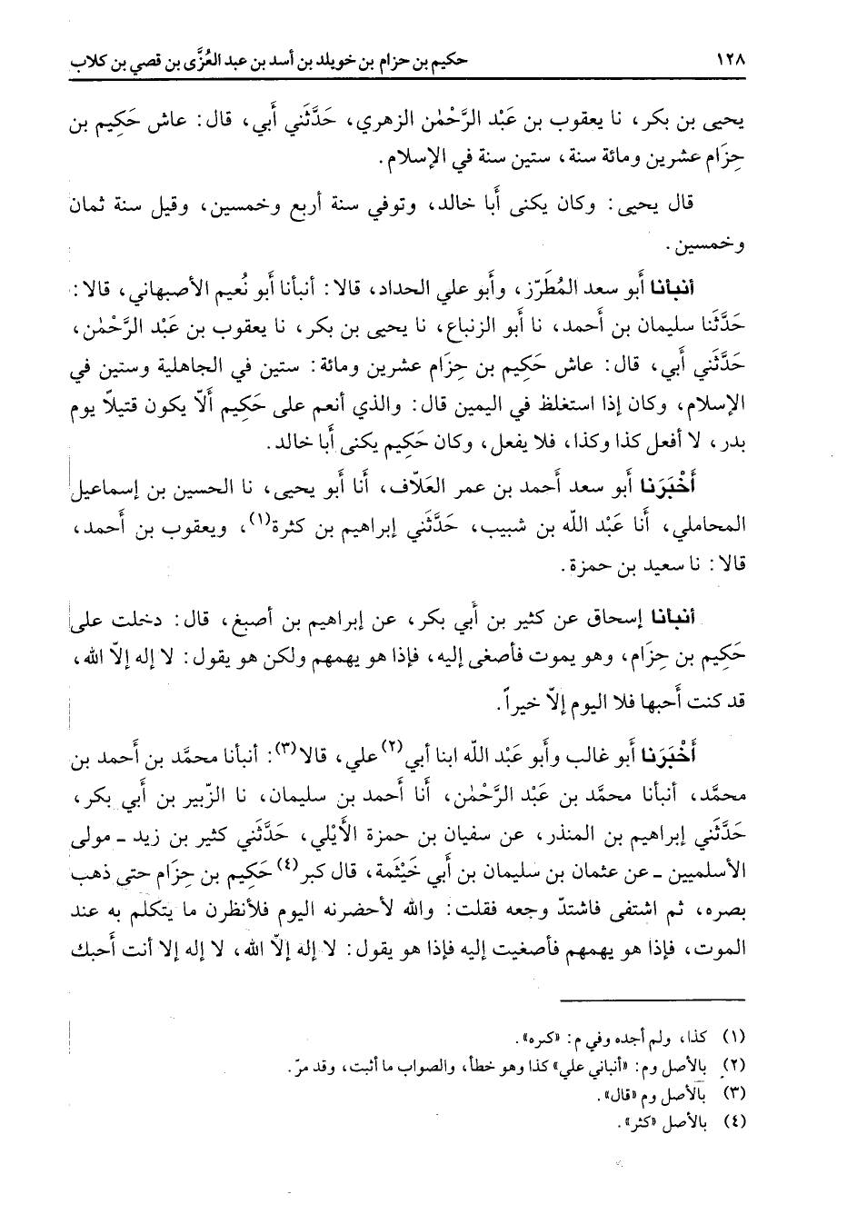 يحيى بن بكر نا أيعقوب بن عبد الرحمن الزهري حدثني أبي قال عاش حكيم بن حزام عشرين ومائة سنة ستين سنة في الإسلام قال يحيى وكان يكنى أبا خالد وتوفي انة أربع وخمسين وقيل سنة ثمان وخمسين أنبأنا أبو سعد المطرز وأبو علي الحداد قالا أنبأنا أبو نعيم الأصبهاني قالا حدثنا سليمان بن أحمد نا أبو الزنباع نا يحيى بن بكر نا يعقوب بن عبد الرحمن حدثني أبي قال عاش حكيم بن حزام عشرين ومائة ستين في الجاهلية وستين في الإسلام وكان إذا استغلظ في اليمين قال والذي أنعم على حكيم ألا يكون قتيلا يوم بدر لا أفعل كذا وكذا فلا يفعل وكان حكيم يكنى أبا خالد أخبرنا أبو سعد أحمد بن عمر العلاف أنا أبو يحيى نا الحسين بن إسماعيل المحاملي أنا عبد الله بن شبيب حدثني إبراهيم بن كثرة (1) ويعقوب بن أحمد قالا نا سعيد بن حمزة أنبأنا إسحاق عن كثير بن أبي بكر عن إبراهيم بن أصبغ قال دخلت على حكيم بن حزام وهو يموت فأصغى إليه فإذا هو يهمهم ولكن هو يقول لا إله إلا الله قد كنت أحبها فلا اليوم إلا خيرا أخبرنا أبو غالب وأبو عبد الله ابنا أبي (2) علي قالا (3) أنبأنا محمد بن أحمد بن محمد أنبأنا محمد بن عبد الرحمن أنا أحمد بن سليمان نا الزبير بن أبي بكر حدثني إبراهيم بن المنذر عن سفيان بن حمزة الأيلي حدثني كثير بن زيد مولى الأسلميين عن عثمان بن سليمان بن أبي خيثمة قال كبر (4) حكيم بن حزام حتى ذهب بصره ثم اشتفى فاشتد وجعه فقلت والله لأحضرنه اليوم فلأنظرن ما يتكلم به عند الموت فإذا هو يهمهم فأصغيت إليه فإذا هو يقول لا إله إلا الله لا إله إلا أنت أحبك