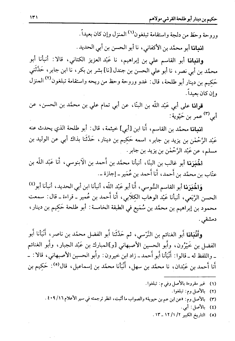 وروحة وحظ من دلجة واستقامة تبلغون (1) المنزل وإن كان بعيدا أنبأنا أبو محمد بن الأكفاني نا أبو الحسن بن أبي الحديد وأنبأنا أبو القاسم علي بن إبراهيم نا عبد العزيز الكتاني قالا أنبأنا أبو محمد بن أبي نصر نا أبو علي الحسن بن جندل نا بشر بن بكر نا ابن جابر حدثني حكيم بن دينار أبو طلحة قال غدو وروحة وحظ من ريحه واستقامة تبلغون (2) المنزل وإن كان بعيدا قرأنا على أبي عبد الله بن البنا عن أبي تمام علي بن محمد بن الحسن عن أبي (3) عمر بن حيوية أنبأنا محمد بن القاسم أنا ابن أبي خيثمة قال أبو طلحة الذي يحدث عنه عبد الرحمن بن يزيد بن جابر اسمه حكيم بن دينار حدثنا بذاك أبي عن الوليد بن مسلم عن عبد الرحمن بن يزيد بن جابر أخبرنا أبو غالب بن البنا أنبأنا محمد بن أحمد بن الآبنوسي أنا عبد الله بن عتاب بن محمد بن أحمد أنا أحمد بن عمير إجازة وأخبرنا أبو القاسم السوسي أنا أبو عبد الله أنبأنا ابن أبي الحديد أنبأنا أبو (4) الحسن الربعي أنبأنا عبد الوهاب الكلابي أنا أحمد بن عمير قراءة قال سمعت محمود بن إبراهيم بن محمد بن سميع في الطبقة الخامسة أبو طلحة حكيم بن دينار دمشقي وأنبأنا أبو الغنائم بن النرسي ثم حدثنا أبو الفضل محمد بن ناصر أنبأنا أبو الفضل بن خيرون وأبو الحسين الأصبهاني والمبارك بن عبد الجبار وأبو الغنائم واللفظ له قالوا أنبأنا أبو احمد زاد ابن خيرون وأبو الحسين الأصبهاني قالا أنا أحمد بن عبدان نا محمد بن سهل أنبأنا محمد بن إسماعيل قال (5) حكيم بن