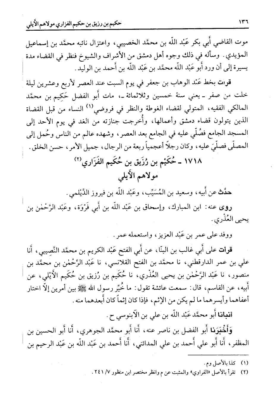 1718 - حكيم بن رزيق بن حكيم الفزاري (2) مولاهم الأيلي حدث عن أبيه وسعيد بن المسيب وعبد الله بن فيروز الديلمي روى عنه ابن المبارك وإسحاق بن عبد الله بن أبي فروة وعبد الرحمن بن يحيى العذري ووفد على عمر بن عبد العزيز واستعمله عمر قرأت على أبي غالب بن البنا عن أبي الفتح عبد الكريم بن محمد النصيبي أنا علي بن عمر الدارقطني نا محمد بن الفتح القلانسي نا عبد الرحمن بن محمد بن منصور نا عبد الرحمن بن يحيى العذري نا حكيم بن رزيق بن حكيم الأيلي عن أبيه عن القاسم قال سمعت عائشة تقول ما خير رسول الله (صلى الله عليه وسلم) بين أمرين إلا اختار أعفاهما وأيسرهما ما لم يكن من الإثم فإذا كان إثما كان أبعدهما منه أنبأنا أبو محمد عبد الله بن علي بن الآبنوسي ح وأخبرنا أبو الفضل بن ناصر عنه أنا أبو محمد الجوهري أنا أبو الحسين بن المظفر أنا أبو علي أحمد بن علي المدائني أنا أحمد بن عبد الله بن عبد الرحيم بن