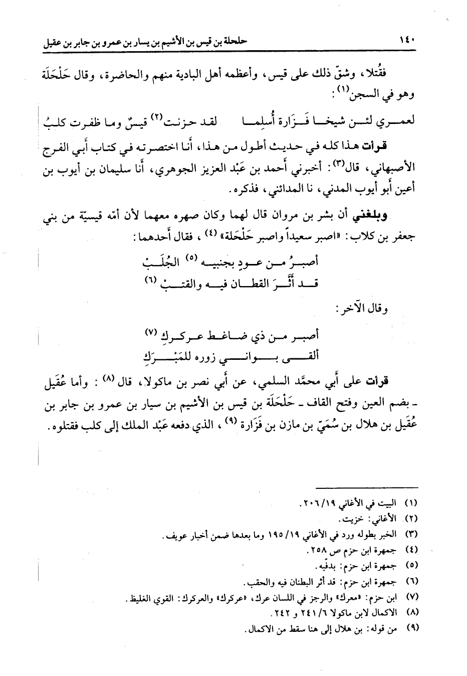 فقتلا وشق ذلك على قيس وأعظمه أهل البادية منهم والحاضرة وقال حلحلة وهو في السجن (1) * لعمري لئن شيخا فزارة أسلما * لقد حزنت (2) قيس وما ظفرت كلب * قرأت هذا كله في حديث أطول من هذا أنا اختصرته في كتاب أبي الفرج الأصبهابي (3) قال أخبرني أحمد بن عبد العزيز الجوهري أنا سليمان بن أيوب بن أعين أبو أيوب المدني نا المدائني فذكره وبلغني أن بشر بن مروان قال لهما وكان صهره معهما لأن أمه قيسية من بني جعفر بن كلاب اصبر سعيدا واصبر حلحلة (4) فقال أحدهما * أصبر من عود بجنبيه (5) الجلب * قد أثر القطان فيه والقتب (6) وقال الآخر * أصبر من ذي ضاغط عركرك (7) * ألقى بواني زوره للمبرك * قرأت على أبي محمد السلمي عن أبي نصر بن ماكولا قال (8) وأما عقيل بضم العين وفتح القاف حلحلة بن قيس بن الأشيم بن سيار بن عمرو بن جابر بن عقيل بن هلال بن سمي بن مازن بن فزارة (9) الذي دفعه عبد الملك إلى كلب فقتلوه