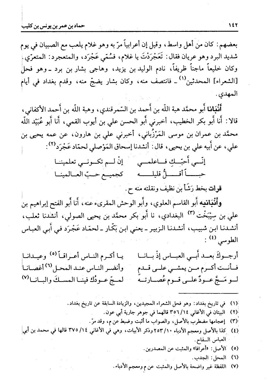 بعضهم كان من أهل واسط وقيل إن أعرابيا مر به وهو غلام يلعب مع الصبيان في يوم شديد البرد وهو عريان فقال تعجردت يا غلام فسمي عجرد والمتعجرد المتعري وكان خليعا ماجنا ظريفا نادم الوليد بن يزيد وهاجى بشار بن برد وهو فحل الشعراء المحدثين (1) فانتصف منه وكان بشار يضج منه وقدم بغداد في أيام المهدي أنبأنا أبو محمد هبة الله بن أحمد بن السمرقندي وهبة الله بن أحمد الأكفاني قالا أنا أبو بكر الخطيب أخبرني أبو الحسن علي بن أيوب القمي أنا أبو عبيد الله محمد بن عمران بن موسى المرزباني أخبرني علي بن هارون عن عمه يحيى بن علي عن أبيه علي بن يحيى قال أنشدنا إسحاق الموصلي لحماد عجرد (2) * إني أحبك فاعلمي * إن لم تكوني تعلمينا حبا أقل قليله * كجميع حب العالمينا * قرأت بخط رشأ بن نظيف ونقلته منه ح وأنبأنيه أبو القاسم العلوي وأبو الوحش المقرئ عنه أنا أبو الفتح إبراهيم بن علي بن سيبخت (3) البغدادي نا أبو بكر محمد بن يحيى الصولي أنشدنا ثعلب أنشدنا ابن شبيب أنشدنا الزبير يعني ابن بكار لحماد عجرد في أبي العباس الطوسي (4) * أرجوك بعد أبي العباس إذ بانا * يا أكرم الناس أعراقا (5) وعيدانا فأنت أكرم من يمشي على قدم * وأنضر الناس عند المحل (6) أغصانا لو مج عود على قوم عصارته * لمج عودك فينا المسك والبانا (7) *