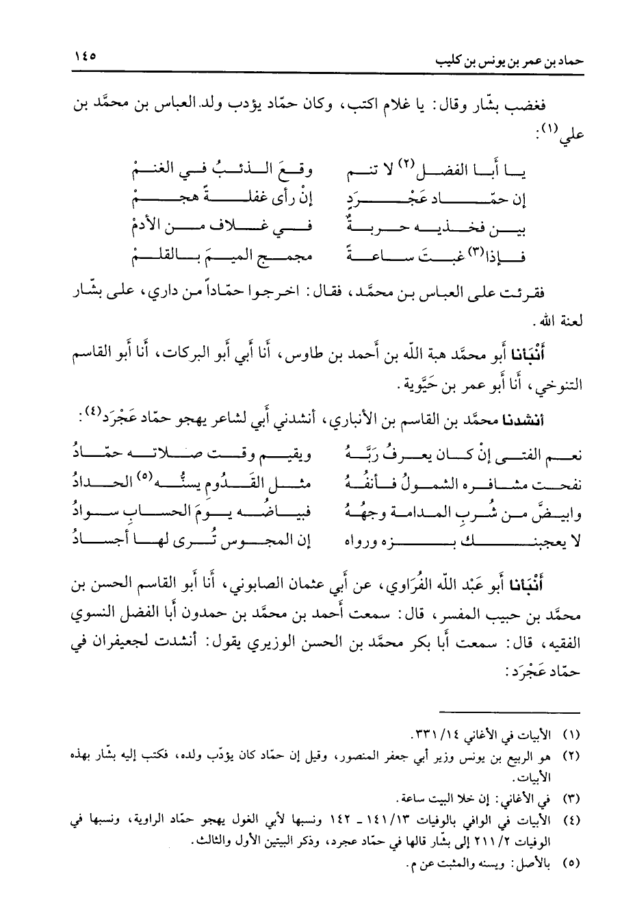 فغضب بشار وقال يا غلام اكتب وكان حماد يؤدب ولد العباس بن محمد بن علي * يا أبا الفضل لا تنم * وقع الذئب في الغنم إن حماد عجرد * إن رأى غفلة هجم بين فخذيه حربة * في غلاف من الأدم فإذا غبت ساعة * مجمج الميم بالقلم * فقرئت على العباس بن محمد فقال اخرجوا حمادا من داري على بشار لعنة الله أنبأنا أبو محمد هبة الله بن أحمد بن طاوس أنا أبي أبو البركات أنا أبو القاسم التنوخي أنا أبو عمر بن حيوية أنشدنا محمد بن القاسم بن الأنباري أنشدني أبي لشاعر يهجو حماد عجرد (4) * نعم الفتى إن كان يعرف ربه * ويقيم وقت صلاته حماد نفحت مشافره الشمول فأنفه * مثل القدوم يسنه (5) الحداد وابيض من شرب المدامة وجهه * فبياضه يوم الحساب سواد لا يعجبنك بزه ورواه * إن المجوس ترى لها أجساد * أنبأنا أبو عبد الله الفراوي عن أبي عثمان الصابوني أنا أبو القاسم الحسن بن محمد بن حبيب المفسر قال سمعت أحمد بن محمد بن حمدون أبا الفضل النسوي الفقيه قال سمعت أبا بكر محمد بن الحسن الوزيري يقول أنشدت لجعيفران