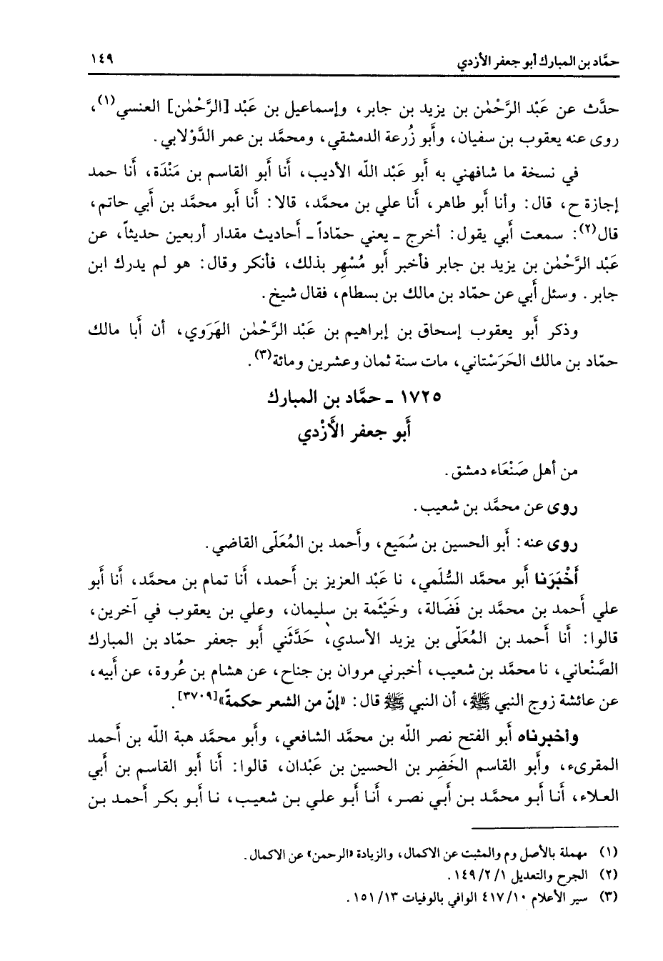 1725 - حماد بن المبارك أبو جعفر الأزدي من أهل صنعاء دمشق روى عن محمد بن شعيب روى عنه أبو الحسين بن سميع وأحمد بن المعلى القاضي أخبرنا أبو محمد السلمي نا عبد العزيز بن أحمد أنا تمام بن محمد أنا أبو علي أحمد بن محمد بن فضالة وخيثمة بن سليمان وعلي بن يعقوب في آخرين قالوا أنا أحمد بن المعلى بن يزيد الأسدي حدثني أبو جعفر حماد بن المبارك الصنعاني نا محمد بن شعيب أخبرني مروان بن جناح عن هشام بن عروة عن أبيه عن عائشة زوج النبي (صلى الله عليه وسلم) أن النبي (صلى الله عليه وسلم) قال إن من الشعر حكمة (3709) وأخبرناه أبو الفتح نصر الله بن محمد الشافعي وأبو محمد هبة الله بن أحمد المقرئ وأبو القاسم الخضر بن الحسين بن عبدان قالوا أنا أبو القاسم بن أبي العلاء أنا أبو محمد بن أبي نصر أنا أبو علي بن شعيب نا أبو بكر أحمد بن