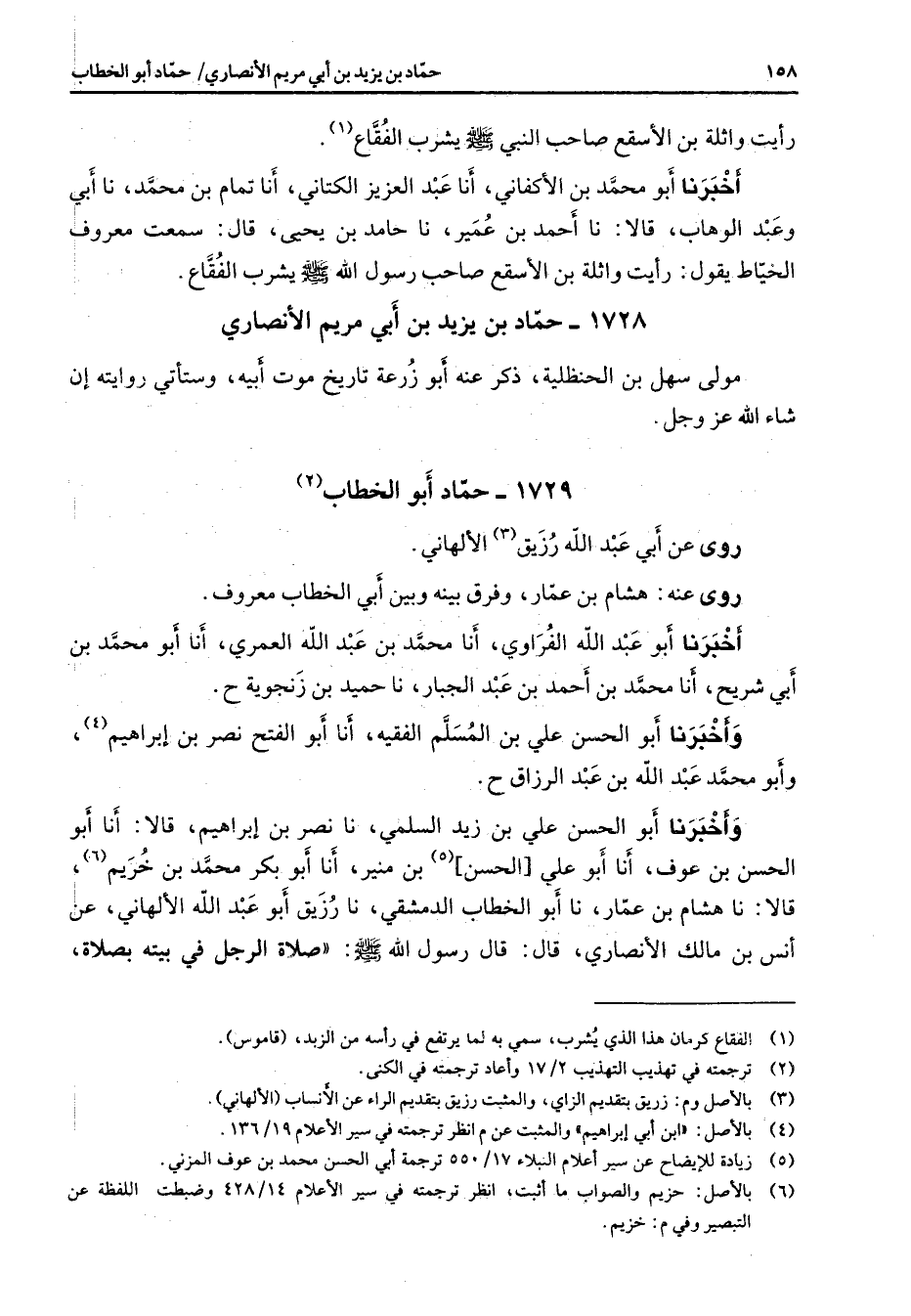 1729 - حماد أبو الخطاب (2) روى عن أبي عبد الله رزيق (3) الألهاني روى عنه هشام بن عمار وفرق بينه وبين أبي الخطاب معروف أخبرنا أبو عبد الله الفراوي أنا محمد بن عبد الله العمري أنا أبو محمد بن أبي شريح أنا محمد بن أحمد بن عبد الجبار نا حميد بن زنجوية ح وأخبرنا أبو الحسن علي بن المسلم الفقيه أنا أبو الفتح نصر بن إبراهيم (4) وأبو محمد عبد الله بن عبد الرزاق ح وأخبرنا أبو الحسن علي بن زيد السلمي نا نصر بن إبراهيم قالا أنا أبو الحسن بن عوف أنا أبو علي الحسن (5) بن منير أنا أبو بكر محمد بن خريم (6) قالا نا هشام بن عمار نا أبو الخطاب الدمشقي نا رزيق أبو عبد الله الألهاني عن أنس بن مالك الأنصاري قال قال رسول الله (صلى الله عليه وسلم) صلاة الرجل في بيته بصلاة