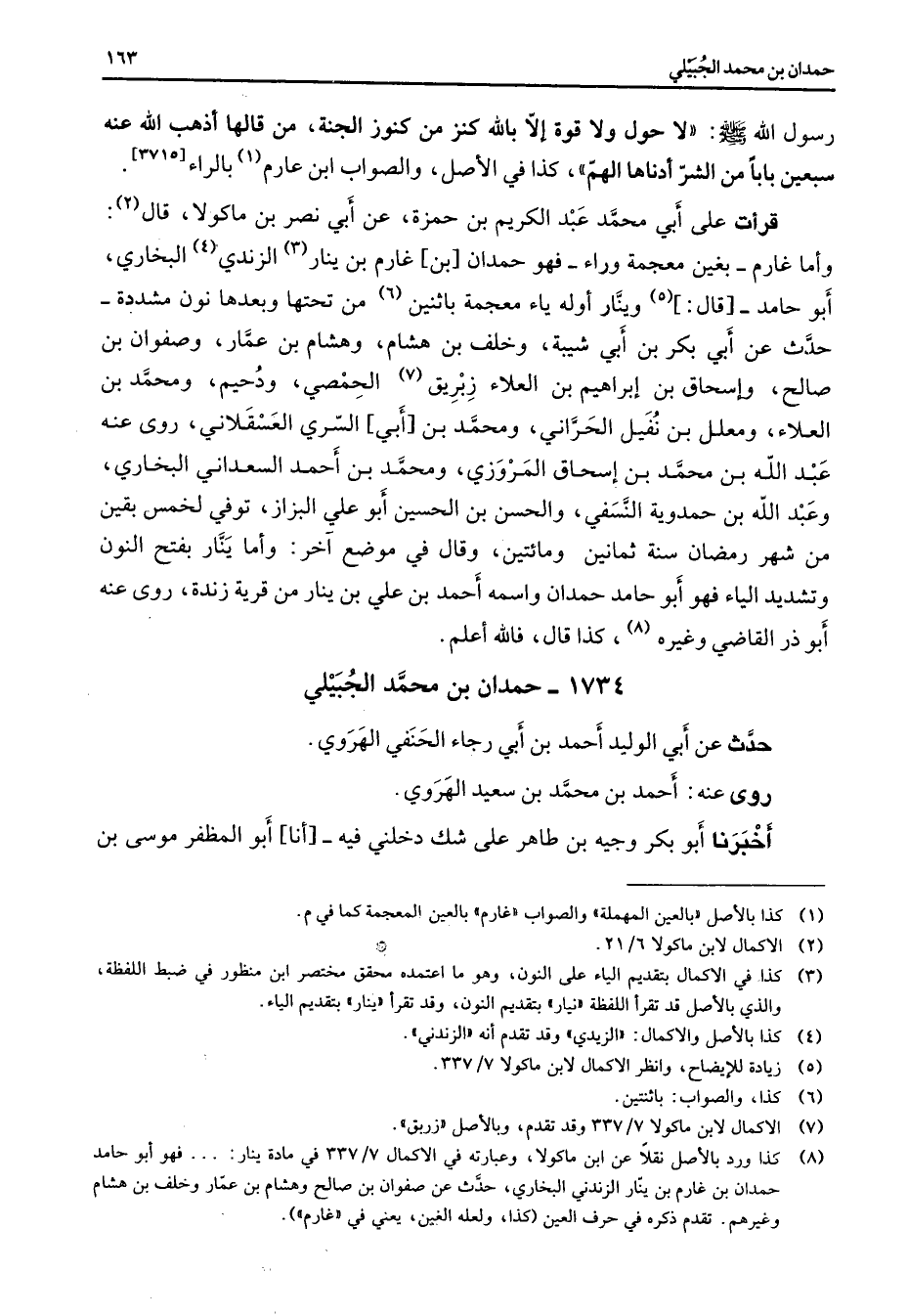 1734 - حمدان بن محمد الجبيلي حدث عن أبي الوليد أحمد بن أبي رجاء الحنفي الهروي روى عنه أحمد بن محمد بن سعيد الهروي أخبرنا أبو بكر وجيه بن طاهر على شك دخلني فيه أنا أبو المظفر موسى بن