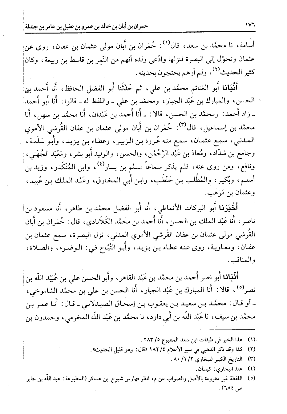 أسامة نا محمد بن سعد قال (1) حمران بن أبان مولى عثمان بن عفان روى عن عثمان وتحول إلى البصرة فنزلها وادعى ولده أنهم من النمر بن قاسط بن ربيعة وكان كثير الحديث (2) ولم أرهم يحتجون بحديثه أنبأنا أبو الغنائم محمد بن علي ثم حدثنا أبو الفضل الحافظ أنا أحمد بن الحسن والمبارك بن عبد الجبار ومحمد بن علي واللفظ له قالوا أنا أبو أحمد زاد أحمد ومحمد بن الحسن قالا أنا أحمد بن عبدان أنا محمد بن سهل أنا محمد بن إسماعيل قال (3) حمران بن أبان مولى عثمان بن عفان القرشي الأموي المدني سمع عثمان سمع منه عروة بن الزبير وعطاء بن يزيد وأبو سلمة وجامع بن شداد ومعاذ بن عبد الرحمن والحسن والوليد أبو بشر ومعبد الجهني ونافع ومن روى عنه فلم يذكر سماعا مسلم بن يسار (4) وابن المنكدر وزيد بن أسلم وبكير والمطلب بن حنطب وابن أبي المخارق وعبد الملك بن عبيد وعثمان بن موهب أخبرنا أبو البركات الأنماطي أنا أبو الفضل محمد بن طاهر أنا مسعود بن ناصر أنا عبد الملك بن الحسن أنا أحمد بن محمد الكلاباذي قال حمران بن أبان القرشي مولى عثمان بن عفان القرشي الأموي المدني نزل البصرة سمع عثمان بن عفان ومعاوية روى عنه عطاء بن يزيد وأبو التياح في الوضوء والصلاة والمناقب أنبأنا أبو نصر أحمد بن محمد بن عبد القاهر وأبو الحسن علي بن عبيد الله بن نصر (5) قالا أنا المبارك بن عبد الجبار أنا الحسن بن علي بن محمد الشاموخي أو قال محمد بن سعيد بن يعقوب بن إسحاق الصيدلاني قال أنا عمر بن محمد بن سيف نا عبد الله بن أبي داود نا محمد بن عبد الله المخرمي وحمدون بن