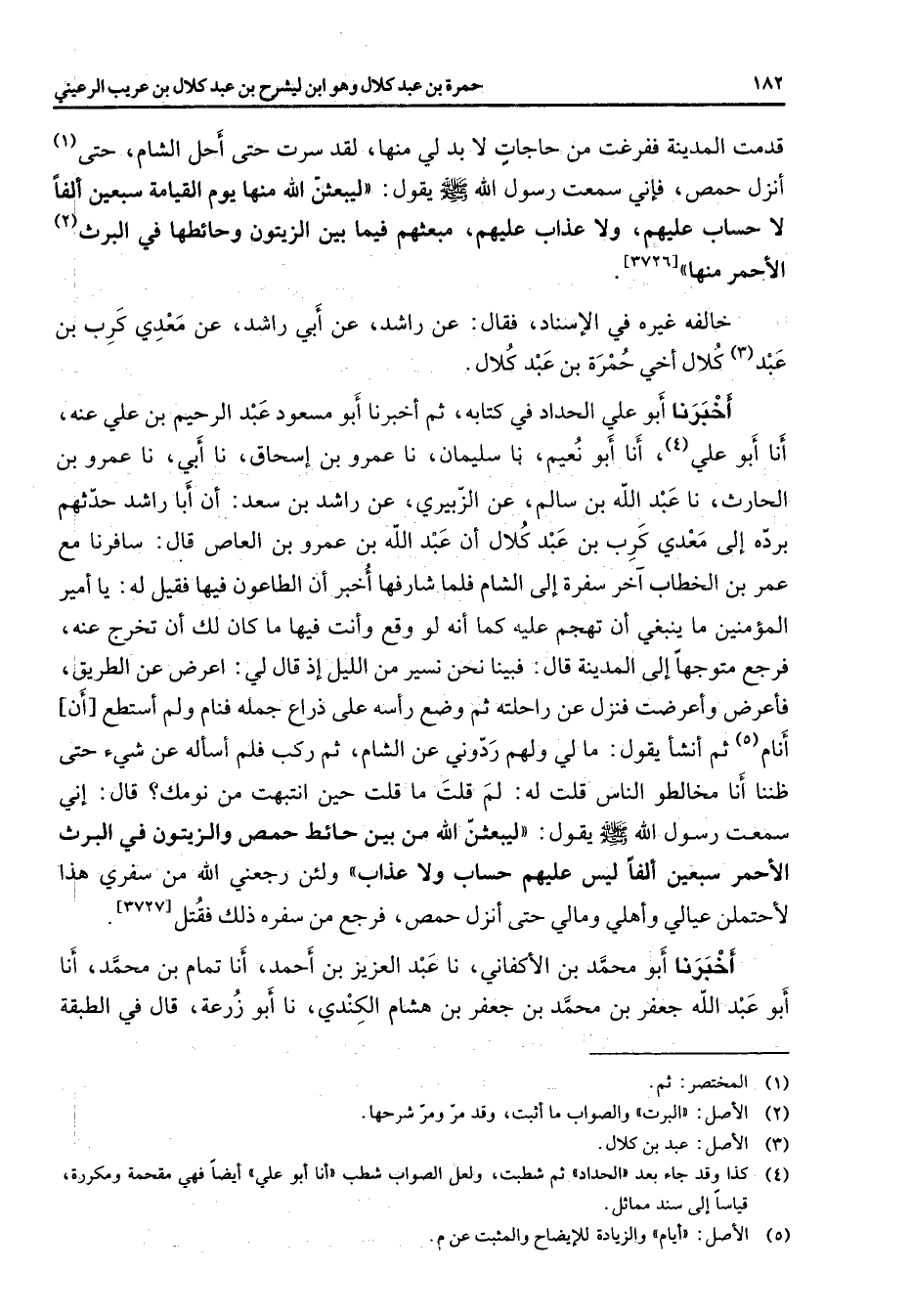 قدمت المدينة ففرغت من حاجات لا بد لي منها لقد سرت حتى أحل الشام حتى (1) أنزل حمص فإني سمعت رسول الله (صلى الله عليه وسلم) يقول ليبعثن الله منها يوم القيامة سبعين ألفا لا حساب عليهم ولا عذاب عليهم مبعثهم فيما بين الزيتون وحائطها في البرث (2) الأحمر منها (3726) خالفه غيره في الإسناد فقال عن راشد عن أبي راشد عن معدي كرب بن عبد كلال أخي حمرة بن عبد كلال أخبرنا أبو علي الحداد في كتابه ثم أخبرنا أبو مسعود عبد الرحيم بن علي عنه أنا أبو علي (4) أنا أبو نعيم نا سليمان نا عمرو بن إسحاق نا أبي نا عمرو بن الحارث نا عبد الله بن سالم عن الزبيري عن راشد بن سعد أن أبا راشد حدثهم برده إلى معدي كرب بن عبد كلال أن عبد الله بن عمرو بن العاص قال سافرنا مع عمر بن الخطاب آخر سفرة إلى الشام فلما شارفها أخبر أن الطاعون فيها فقيل له يا أمير المؤمنين ما ينبغي أن تهجم عليه كما أنه لو وقع وأنت فيها ما كان لك أن تخرج عنه فرجع متوجها إلى المدينة قال فبينا نحن نسير من الليل إذ قال لي اعرض عن الطريق فأعرض وأعرضت فنزل عن راحلته ثم وضع رأسه على ذراع جمله فنام ولم أستطع أن أنام (5) ثم أنشا يقول ما لي ولهم ردوني عن الشام ثم ركب فلم أسأله عن شئ حتى ظننا أن مخالطو الناس قلت له لم قلت ما قلت حين انتبهت من نومك قال إني سمعت رسول الله (صلى الله عليه وسلم) يقول لبيعثن الله من بين حائط حمص والزيتون في البرث الأحمر سبعين ألفا ليس عليهم حساب ولا عذاب ح ولئن رجعني الله من سفري هذا لأحتملن عيالي وأهلي ومالي حتى أنزل حمص فرجع من سفره ذلك فقتل (3727) أخبرنا أبو محمد بن الأكفاني نا عبد العزيز بن أحمد أنا تمام بن محمد أنا أبو عبد الله جعفر بن محمد بن جعفر بن هشام الكندي نا أبو زرعة قال في الطبقة