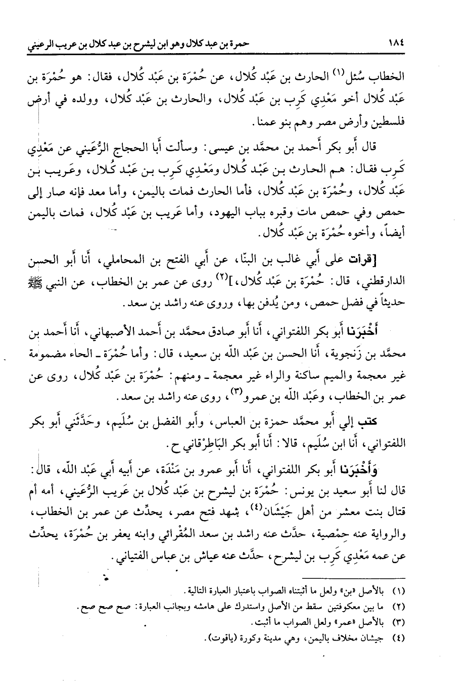 الخطاب سئل (1) الحارث بن عبد كلال عن حمرة بن عبد كلال فقال هو حمرة بن عبد كلال أخو معدي كرب بن عبد كلال والحارث بن عبد كلال وولده في أرض فلسطين وأرض مصر وهم بنو عمنا قال أبو بكر أحمد بن محمد بن عيسى وسألت أبا الحجاج الرعيني عن معدي كرب فقال هم الحارث بن عبد كلال ومعدي كرب بن عبد كلال وعريب بن عبد كلال وحمرة بن عبد كلال فأما الحارث فمات باليمن وأما معد فإنه صار إلي حمص وفي حمص مات وقبره بباب اليهود وأما عريب بن عبد كلال فمات باليمن أيضا وأخوه حمرة بن عبد كلال قرأت على أبي غالب بن النبا عن أبي الفتح بن المحاملي أنا أبو الحسن الدراقطني قال حرمة بن عبد كلال روى عن عمر بن الخطاب عن النبي (صلى الله عليه وسلم) حديثا في فضل حمص ومن يدفن بها وروى عنه راشد بن سعد أخبرنا أبو بكر اللفتواني أنا أبو صادق محمد بن أحمد الأصبهاني أنا أحمد بن محمد بن زنجوية أنا الحسن بن عبد الله بن سعيد قال وأما حمرة الحاء مضمومة غير معجمة والميم ساكنة والراء غير معجمة ومنهم حمرة بن عبد كلال روى عن عمر بن الخطاب وعبد الله بن عمرو (3) روى عنه راشد بن سعد كتب إلي أبو محمد حمزة بن العباس وأبو الفضل بن سليم وحدثني أبو بكر اللفتواني أنا ابن سليم قالا أنا أبو بكر الباطرقاني ح وأخبرنا أبو بكر اللفتواني أنا أبو عمرو بن مندة عن أبيه أبي عبد الله قال قال لنا أبو سعيد بن يونس حمرة بن ليشرح بن عبد كلال بن عريب الرعيني أمه أم قتال بنت معشر من أهل جيشان (4) شهد فتح مصر يحدث عن عمر بن الخطاب والرواية عنه حمصية حدث عنه راشد بن سعد المقرائي وابنه يعفر بن حمرة يحدث عن عمه معدي كرب بن ليشرح حدث عنه عياش بن عباس الفتياني