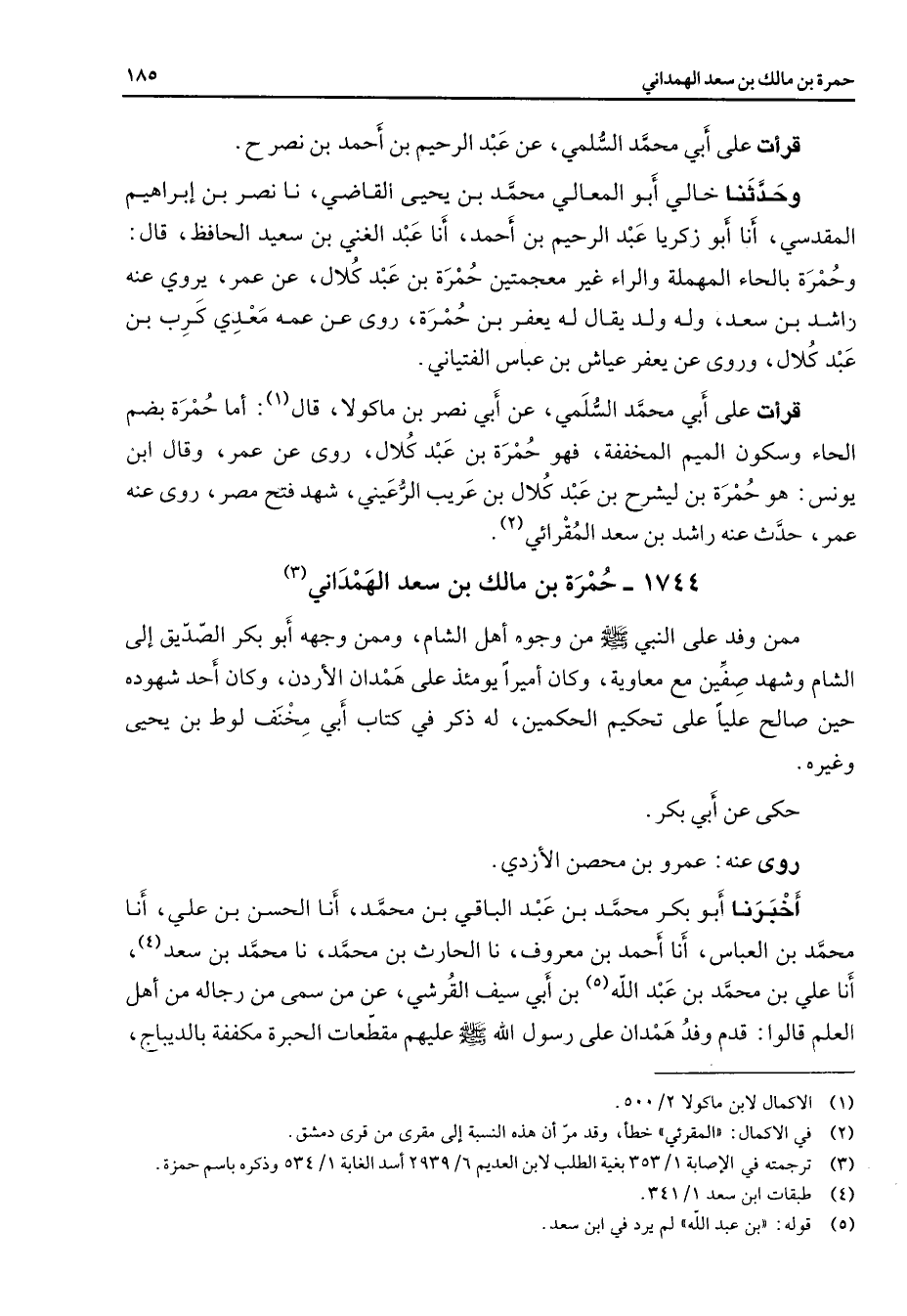 1744 - حمرة بن مالك بن سعد الهمداني (3) ممن وفد على النبي (صلى الله عليه وسلم) من وجوه أهل الشام وممن وجهه أبو بكر الصديق إلى الشام وشهد صفين مع معاوية وكان أميرا يومئذ على همدان الأردن وكان أحد شهوده حين صالح عليا على تحكيم الحكمين له ذكر في كتاب أبي مخنف لوط بن يحيى وغيره حكى عن أبي بكر روى عنه عمرو بن محصن الأزدي أخبرنا أبو بكر محمد بن عبد الباقي بن محمد أنا الحسن بن علي أنا محمد بن العباس أنا أحمد بن معروف نا الحارث بن محمد نا محمد بن سعد (4) أنا علي بن محمد بن عبد الله (5) بن أبي سيف القرشي عن من سمى من رجاله من أهل العلم قالوا قدم وفد همدان على رسول الله (صلى الله عليه وسلم) عليهم مقطعات الحبرة مكففة بالديباج