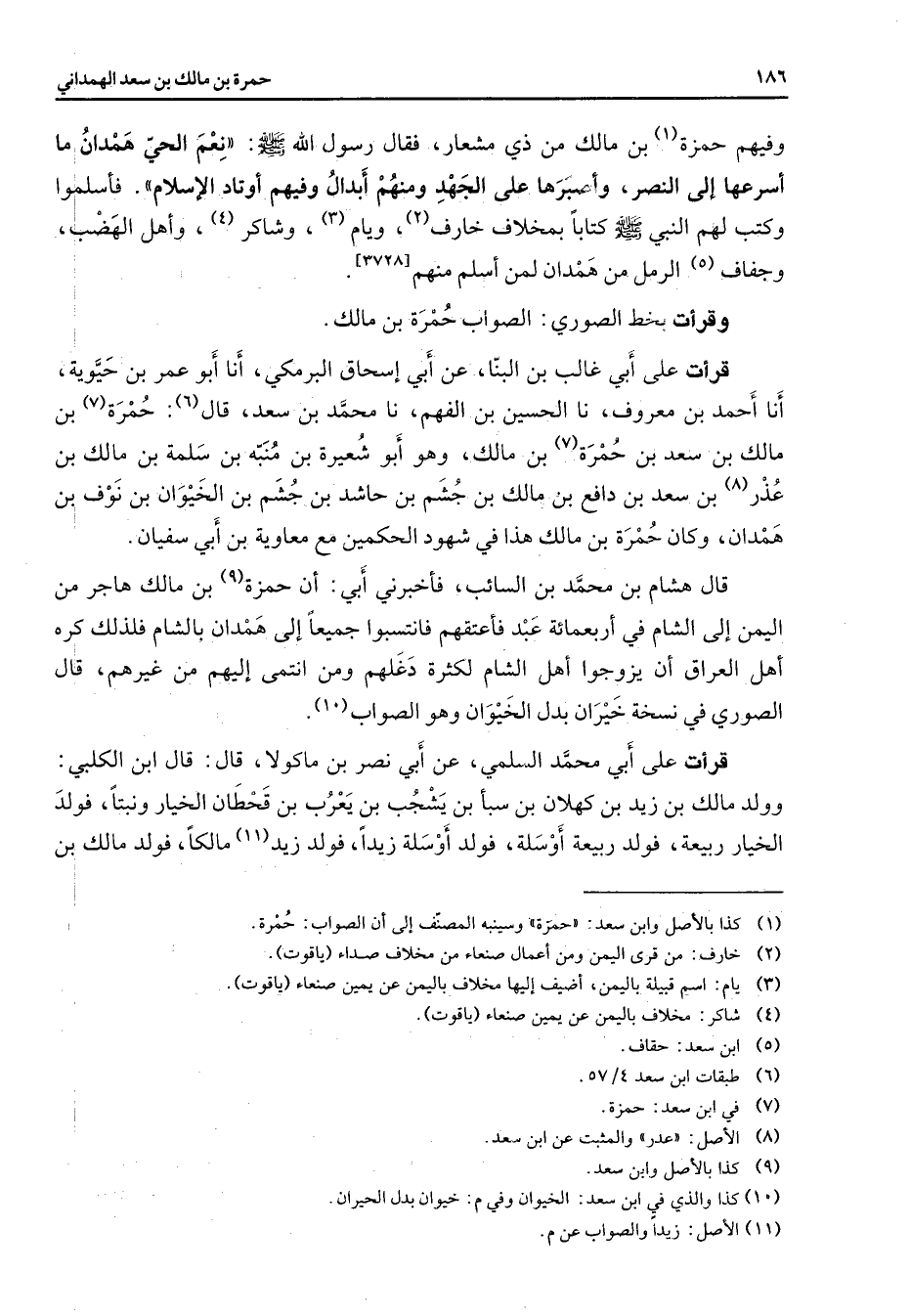 وفيهم حمزة (1) بن مالك من ذي مشعار فقال رسول الله (صلى الله عليه وسلم) نعم الحي همدان ما أسرعها إلى النصر وأصبرها على الجهد ومنهم أبدال وفيهم أوتاد الإسلام فأسلموا وكتب لهم النبي (صلى الله عليه وسلم) كتابا بمخلاف خارف (2) ويام (3) وشاكر (4) وأهل الهضب وجفاف (5) الرمل من همدان لمن أسلم منهم (3728) وقرأت بخط الصوري الصواب حمرة بن مالك قرأت على أبي غالب بن البنا عن أبي إسحاق البرمكي أنا أبو عمر بن حيوية أنا أحمد بن معروف نا الحسين بن الفهم نا محمد بن سعد قال (6) حمرة (7) بن مالك بن سعد بن حمرة (7) بن مالك وهو أبو شعيرة بن منبه بن سلمة بن مالك بن عذر (8) بن سعد بن دافع بن مالك بن جشم بن حاشد بن جشم بن الخيوان بن نوف بن همدان وكان حمرة بن مالك هذا في شهود الحكمين مع معاوية بن أبي سفيان قال هشام بن محمد بن السائب فأخبرني أبي أن حمزة (9) بن مالك هاجر من اليمن إلى الشام في أربعمائة عبد فأعتقهم فانتسبوا جميعا إلى همدان بالشام فلذلك كره أهل العراق أن يزوجوا أهل الشام لكثرة دغلهم ومن انتمى إليهم من غيرهم قال الصوري في نسخة خيران بدل الخيوان وهو الصواب (10) قرأت على أبي محمد السلمي عن أبي نصر بن ماكولا قال قال ابن الكلبي وولد مالك بن زيد بن كهلان بن سبأ بن يشجب بن يعرب بن قحطان الخيار ونبتا فولد الخيار ربيعة فولد ربيعة أو سلة فولد أو سلة زيادا فولد زيد (11) مالكا فولد مالك بن