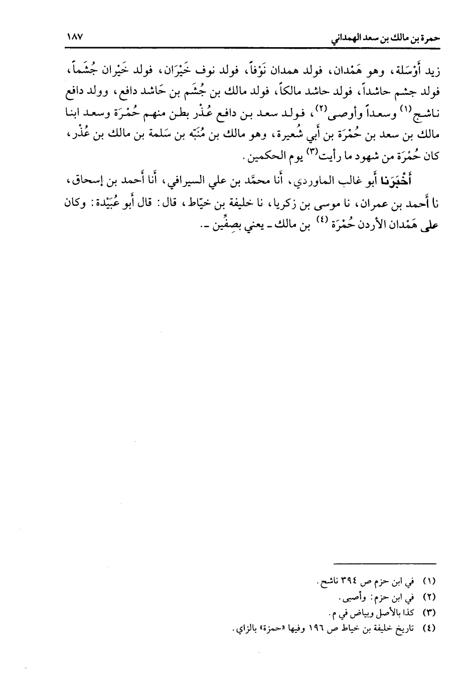 زيد أو سلة وهو همدان فولد همدان نوفا فولد نوف خيران فولد خيران جشما فولد جشم حاشدا فولد حاشد مالكا فولد مالك بن جشم بن حاشد دافع وولد دافع ناشج (1) وسعدا وأوصى (2) فولد سعد بن دافع عذر بطن منهم حمرة وسعد ابنا مالك بن سعد بن حمرة بن أبي شعيرة وهو مالك بن منبه بن سلمة بن مالك بن عذر كان حمرة من شهود ما رأيت (3) يوم الحكمين أخبرنا أبو غالب الماوردي أنا محمد بن علي السيرافي أنا أحمد بن إسحاق نا أحمد بن عمران نا موسى بن زكريا نا خليفة بن خياط قال أبو عبيدة وكان على همدان الأردن حمرة (4) بن مالك يعني بصفين