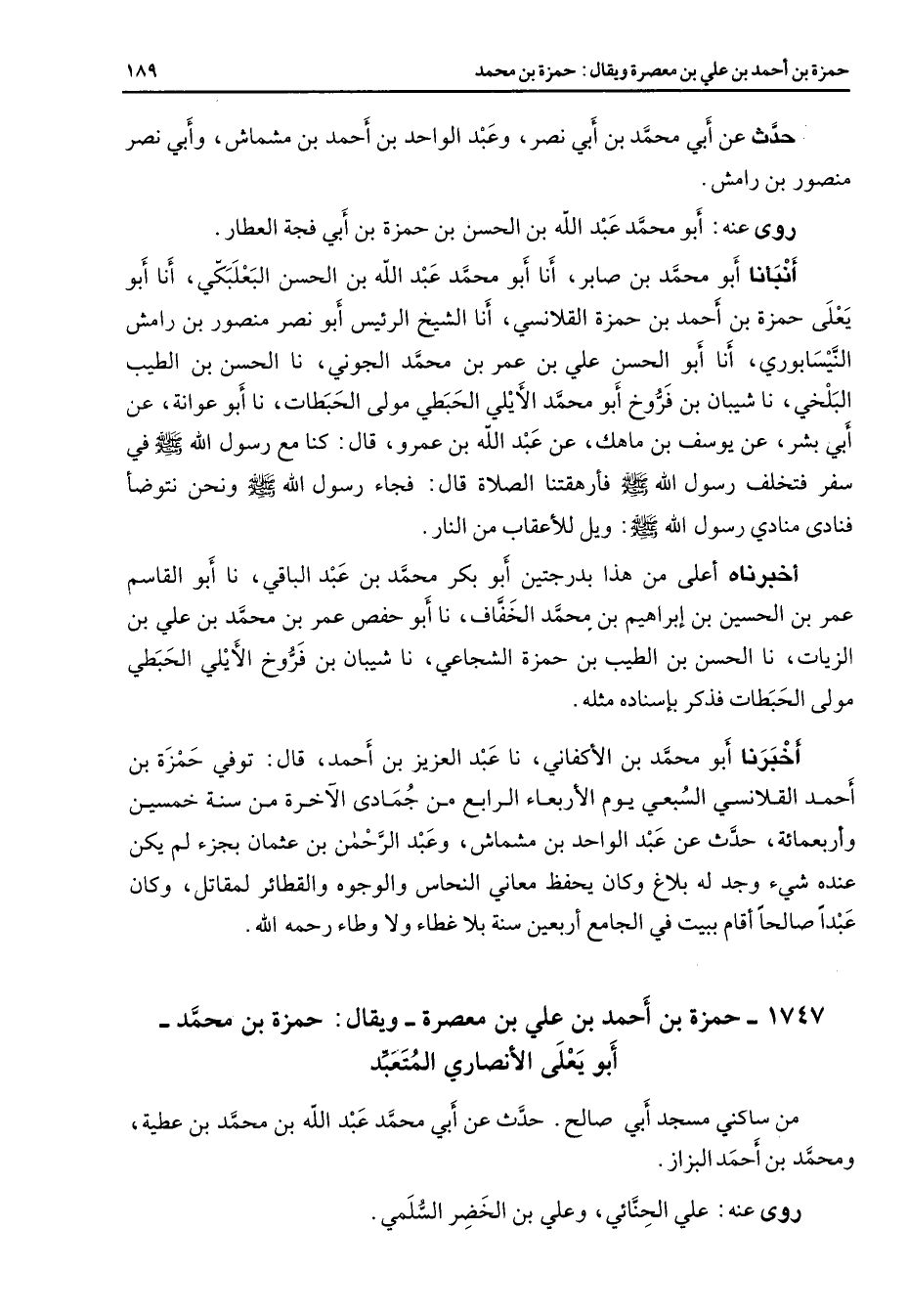 1747 - حمزة بن أحمد بن علي بن معصرة ويقال حمزة بن محمد أبو يعلى الأنصاري المتعبد من ساكني مسجد أبي صالح حدث عن أبي محمد عبد الله بن محمد بن عطية ومحمد بن أحمد البزاز روى عنه الحنائي وعلي بن الخضر السلمي