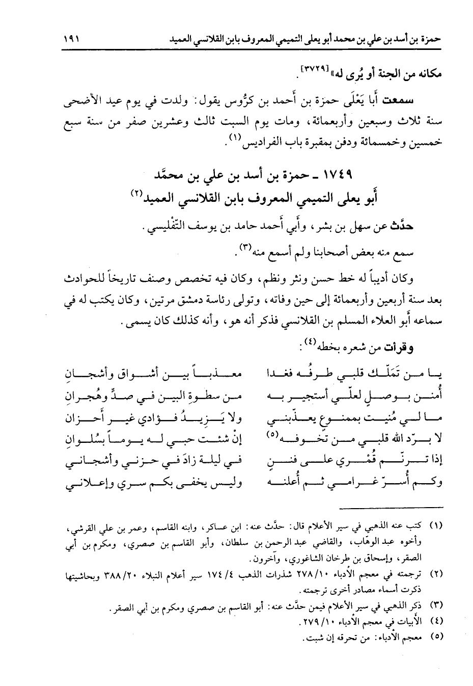 1749 - حمزة بن أسد بن علي بن محمد أبو يعلى التميمي المعروف بابن القلانسي العميد (2) حدث عن سهل بن بشر وأبي أحمد حامد بن يوسف التفليسي سمع منه بعض أصحابنا ولم أسمع منه (3) وكان أديبا له خط حسن ونثر ونظم وكان فيه تخصص وصنف تاريخا للحوادث بعد سنة أربعين وأربعمائة إلى حين وفاته وتولى رئاسة دمشق مرتين وكان يكتب له في سماعه أبو العلاء المسلم بن القلانسي فذكر أنه هو وأنه كذلك كان يسمى وقرأت من شعره بخطه (4) * يا من تملك قلبي طرفه فغدا * معذبا بين أشواق وأشجان أمنن بوصل لعلي أستجير به * من سطوة البين في صد وهجران مالي منيت بممنوع يعذبني * ولا يزيد فؤادي غير أحزان لا برد الله قلبي من تخوفه (5) * إن شئت حبي له يوما بسلوان * * إذا ترنم قمري على فنن * في ليلة زاد في حزني وأشجاني وكم أسر غرامي ثم أعلنه * وليس يخفى بكم سري وإعلاني