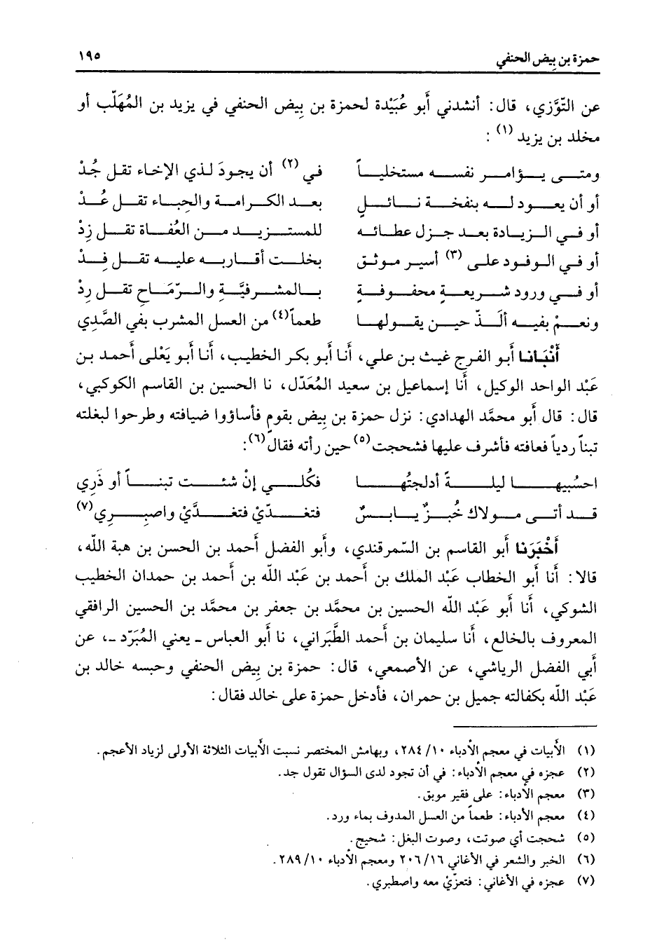 عن التوزي قال أنشدني أبو عبيدة لحمزة بن بيض الحنفي في يزيد بن المهلب أو مخلد بن يزيد (1) * ومتى يؤامر نفسه مستخليا * في (2) أن يجود لذي الإخاء تقل جد أو أن يعود له بنفخة نائل * بعد الكرامة والحباء تقل عد أو في الزيادة بعد جزل عطائه * للمستزيد من العفاة تقل زد أو في الوفود على (3) أسير موثق * بخلت أقاربه عليه تقل فد أو في ورود شريعة محفوفة * بالمشرفية والرماح تقل رد ونعم بفيه ألذ حين يقولها * طعما (4) من العسل المشرب بفي الصدي * أنبأنا أبو الفرج غيث بن علي أنا أبو بكر الخطيب أنا أبو يعلى أحمد بن عبد الواحد الوكيل أنا إسماعيل بن سعيد المعدل نا الحسين بن القاسم الكوكبي قال قال أبو محمد الهدادي نزل حمزة بن بيض بقوم فأساؤوا ضيافته وطرحوا لبغلته تبنا رديا فعافته فأشرف عليها فشحجت (5) حين رأته فقال (6) * احسبيها ليلة أدلجتها * فكلي إن شئت تبنا أو ذري قد أتى مولاك خبز يابس * فتغدي فتغدي واصبري (7) * أخبرنا أبو القاسم بن السمرقندي وأبو الفضل أحمد بن الحسن بن هبة الله قالا أنا أبو الخطاب عبد الملك بن أحمد بن عبد الله بن أحمد بن حمدان الخطيب الشوكي أنا أبو عبد الله الحسين بن محمد بن جعفر بن محمد بن الحسين الرافقي المعروف بالخالع أنا سليمان بن أحمد الطبراني نا أبو العباس يعني المبرد عن أبي الفضل الرياشي عن الأصمعي قال حمزة بن بيض الحنفي وحبسه خالد بن