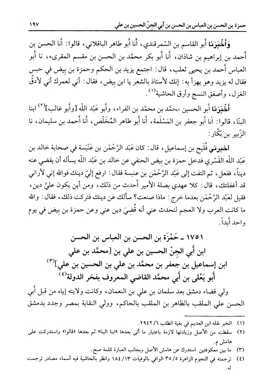 1751 - حمزة بن الحسن بن العباس بن الحسن ابن أبي الجن الحسين بن علي بن محمد بن علي ابن إسماعيل بن جعفر بن محمد بن علي بن الحسين بن علي (3) أبو يعلى بن أبي محمد القاضي المعروف بفخر الدولة (4) ولي قضاء دمشق بعد سلمان بن علي بن النعمان وكانت ولايته إياه من قبل أبي الحسن علي الملقب بالظاهر بن الملقب بالحاكم وولي النقابة بمصر وجدد بدمشق