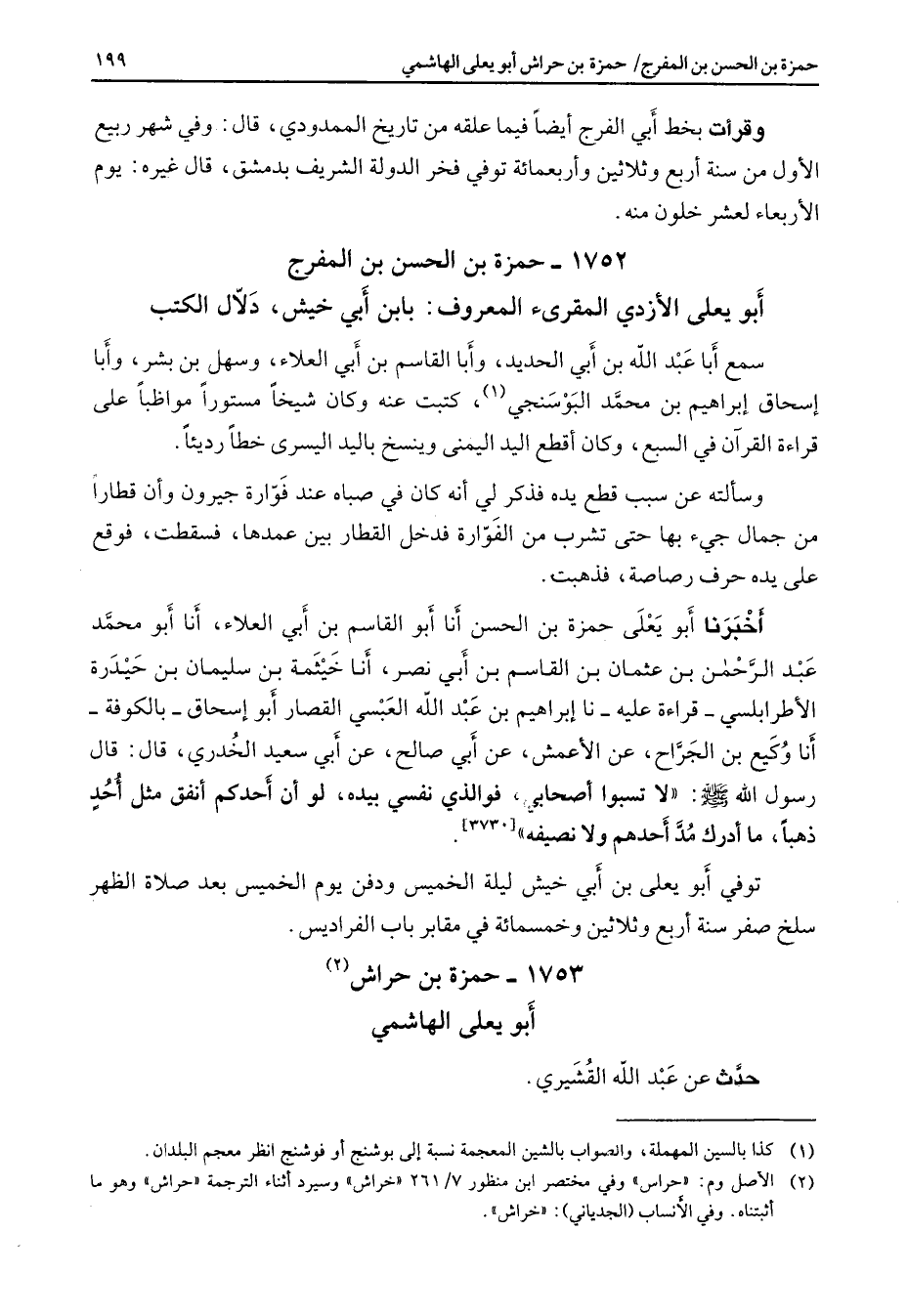 1752 - حمزة بن الحسن بن المفرج أبو يعلى الأزدي المقرئ المعروف بابن أبي خيش دلال الكتب سمع أبا عبد الله بن أبي الحديد وأبا القاسم بن أبي العلاء وسهل بن بشر وأبا إسحاق إبراهيم بن محمد البوسنجي (1) كتبت عنه وكان شيخا مستورا مواظبا على قراءة القرآن في السبع وكان أقطع اليد اليمنى وينسخ باليد اليسرى خطا رديئا وسألته عن سبب قطع يده فذكر لي أنه كان في صباه عند فوارة جيرون وأن قطارا من جمال جئ بها حتى تشرب من الفوارة فدخل القطار بين عمدها فسقطت فوقع على يده حرف رصاصة فذهبت أخبرنا أبو يعلى حمزة بن الحسن أنا أبو القاسم بن أبي العلاء أنا أبو محمد عبد الرحمن بن عثمان بن القاسم بن أبي نصر أنا خيثمة بن سليمان بن حيدرة الأطرابلسي قراءة عليه نا إبراهيم بن عبد الله العبسي القصار أبو إسحاق بالكوفة أنا وكيع بن الجراح عن الأعمش عن أبي صالح عن أبي سعيد الخدري قال قال رسول الله (صلى الله عليه وسلم) لا تسبوا أصحابي فوالذي نفسي بيده لو أن أحدكم أنفق مثل أحد ذهبا ما أدرك مد أحدهم ولا نصيفه (3730) توفي أبو يعلى بن أبي خيش ليلة الخميس ودفن يوم الخميس بعد صلاة الظهر سلخ صفر سنة أربع وثلاثين وخمسمائة في مقابر باب الفراديس
