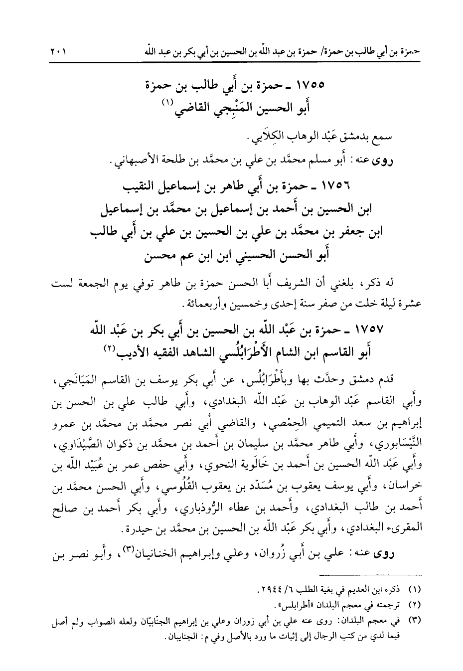 1755 - حمزة بن أبي طالب بن حمزة أبو الحسين المنبجي القاضي (1) سمع بدمشق عبد الوهاب الكلابي روى عنه أبو مسلم محمد بن علي بن محمد بن طلحة الأصبهاني