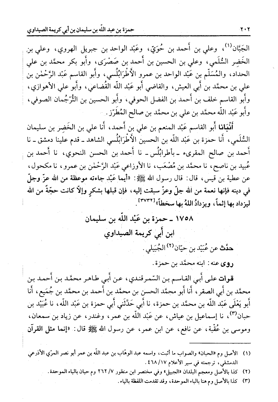 1758 - حمزة بن عبد الله بن سليمان ابن أبي كريمة الصيداوي حدث عن عبيد بن حيان (2) الجبيلي روى عنه ابنه محمد بن حمزة قرأت على أبي القاسم بن السمرقندي عن أبي طاهر محمد بن أحمد بن محمد بن أبي الصقر أنا أبو محمد الحسن بن محمد بن أحمد بن محمد بن جميع أنا أبو يعلى عبد الله بن محمد بن حمزة نا أبي حدثني أبي حمزة بن عبد الله نا عبيد بن حبان (3) نا إسماعيل بن عياش عن عبد الله بن عمر وغندر عن زياد بن سمعان وموسى بن عقبة عن نافع عن ابن عمر عن رسول الله (صلى الله عليه وسلم) قال إنما مثل القرآن