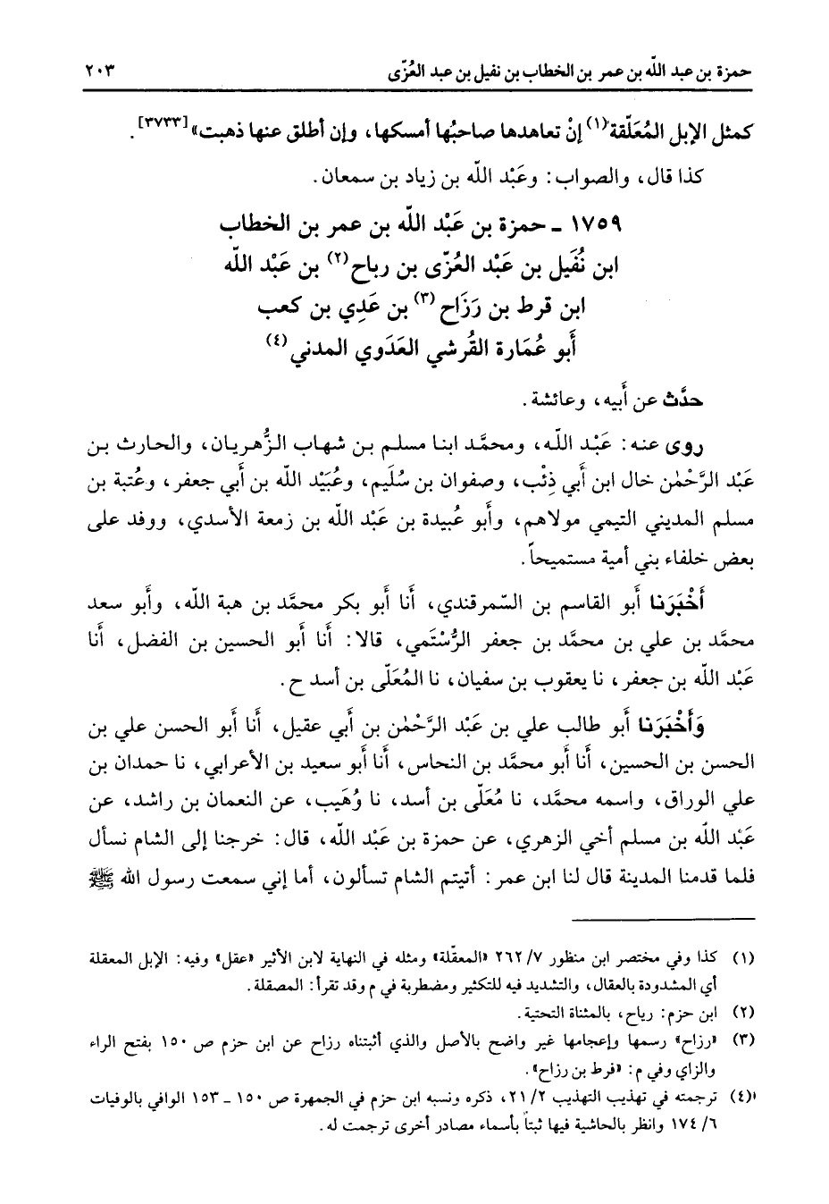 1759 - حمزة بن عبد الله بن عمر بن الخطاب ابن نفيل بن عبد العزى بن رباح (2) بن عبد الله بن قرط بن رزاح (3) بن عدي بن كعب أبو عمارة القرشي العدوي المدني (4) حدث عن أبيه وعائشة روى عنه عبد الله ومحمد ابنا مسلم بن شهاب الزهريان والحارث بن عبد الرحمن خال ابن أبي ذئب وصفوان بن سليم وعبيد الله بن أبي جعفر وعتبة بن مسلم المديني التيمي مولاهم وأبو عبيدة بن عبد الله بن زمعة الأسدي ووفد على بعض خلفاء بني أمية مستميحا أخبرنا أبو القاسم بن السمرقندي أنا أبو بكر محمد بن هبة الله وأبو سعد محمد بن علي بن محمد بن جعفر الرستمي قالا أنا أبو الحسين بن الفضل أنا عبد الله بن جعفر نا يعقوب بن سفيان نا المعلى بن أسد ح وأخبرنا أبو طالب علي بن عبد الرحمن بن أبي عقيل أنا أبو الحسن علي بن الحسن بن الحسين أنا أبو محمد بن النحاس أنا أبو سعيد بن الأعرابي نا حمدان بن علي الوراق واسمه محمد نا معلى بن أسد نا وهيب عن النعمان بن راشد عن عبد الله بن مسلم أخي الزهري عن حمزة بن عبد الله قال خرجنا إلى الشام نسأل فلما قدمنا المدينة قال لنا ابن عمر أتيتم الشام تسألون أما إني سمعت رسول الله (صلى الله عليه وسلم)
