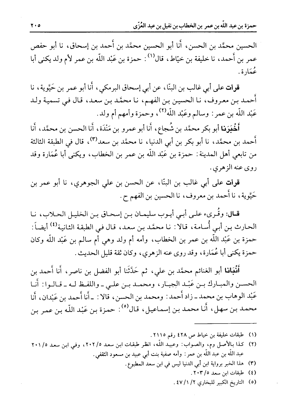 الحسين محمد بن الحسن أنا أبو الحسين محمد بن أحمد بن إسحاق نا أبو حفص عمر بن أحمد نا خليفة بن خياط قال حمزة بن عبد الله بن عمر لأم ولد يكنى أبا عمارة قرأت على أبي غالب بن البنا عن أبي إسحاق البرمكي أنا أبو عمر بن حيوية نا أحمد بن معروف نا الحسين بن الفهم نا محمد بن سعد قال في تسمية ولد عبد الله بن عمر وسالم وعبد الله (2) وحمزة وأمهم أم ولد أخبرنا أبو بكر محمد بن شجاع أنا أبو عمرو بن مندة أنا الحسن بن محمد أنا أحمد بن محمد نا أبو بكر بن أبي الدنيا نا محمد بن سعد (3) قال في الطبقة الثالثة من تابعي أهل المدينة حمزة بن عبد الله بن عمر بن الخطاب ويكنى أبا عمارة وقد روى عنه الزهري قرأت على أبي غالب بن البنا عن الحسن بن علي الجوهري نا أبو عمر بن حيوية نا أحمد بن معروف نا الحسين بن الفهم ح قال وقرئ على أبي أيوب سليمان بن إسحاق بن الخليل الحلاب نا الحارث بن أبي أسامة قالا نا محمد بن سعد قال في الطبقة الثانية (4) أيضا حمزة بن عبد الله بن عمر بن الخطاب وأمه أم ولد وهي أم سالم بن عبد الله وكان حمزة يكنى أبا عمارة وقد روى عنه الزهري وكان ثقة قليل الحديث أنبأنا أبو الغنائم محمد بن علي ثم حدثنا أبو الفضل بن ناصر أنا أحمد بن الحسن والمبارك بن عبد الجبار ومحمد بن علي واللفظ له قالوا أنا عبد الوهاب بن محمد زاد أحمد ومحمد بن الحسن قالا أنا أحمد بن عبدان أنا محمد بن سهل أنا محمد بن إسماعيل قال (5) حمزة بن عبد الله بن عمر بن