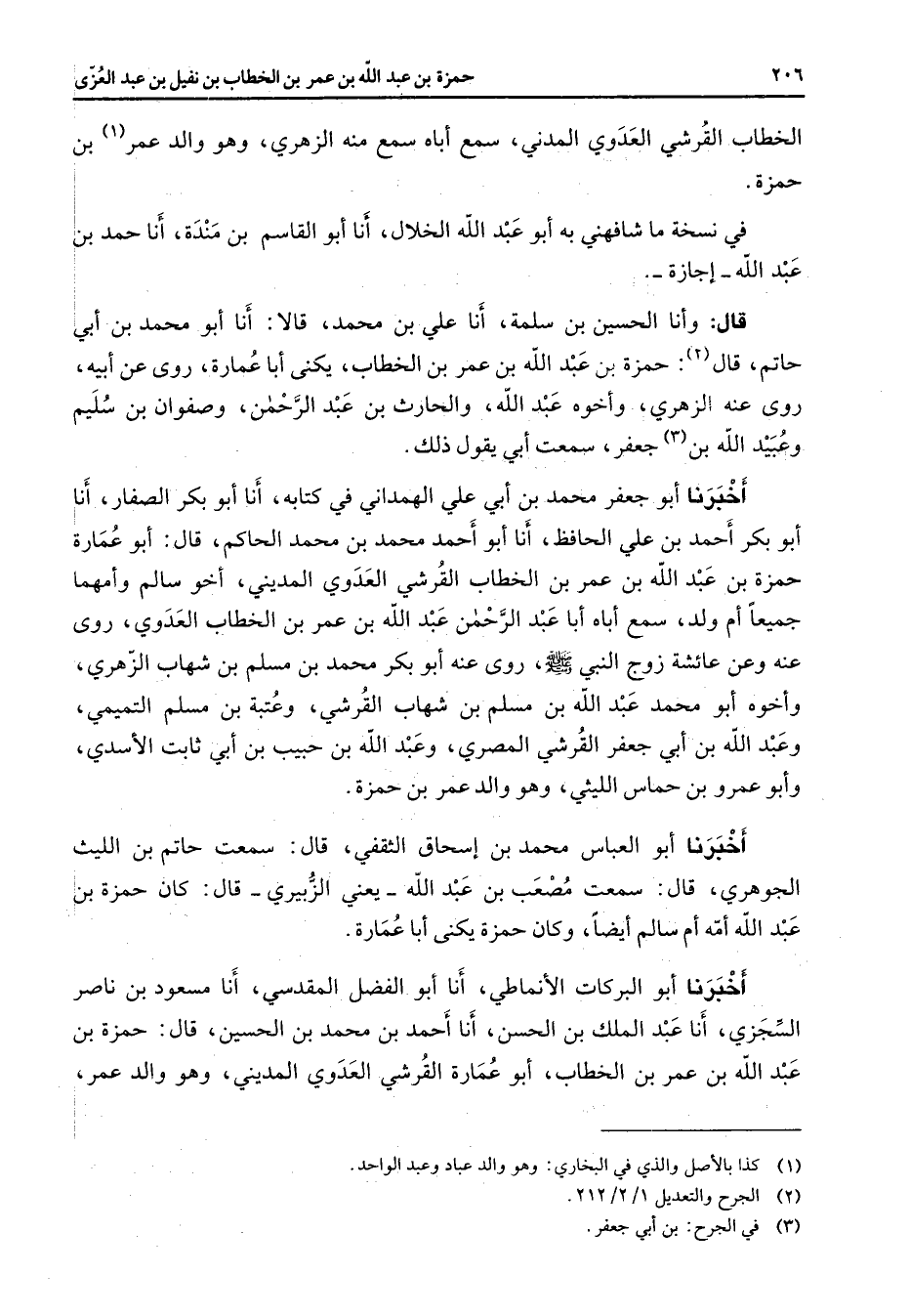 الخطاب القرشي العدوي المدني سمع أباه سمع منه الزهري وهو والد عمر (1) بن حمزة في نسخة ما شافهني به أبو عبد الله الخلال أنا أبو القاسم بن مندة أنا حمد بن عبد الله إجازة قال وأنا الحسين بن سلمة أنا علي بن محمد قالا أنا أبو محمد بن أبي حاتم قال (2) حمزة بن عبد الله بن عمر بن الخطاب يكنى أبا عمارة روى عن أبيه روى عنه الزهري وأخوه عبد الله والحارث بن عبد الرحمن وصفوان بن سليم وعبيد الله بن (3) جعفر سمعت أبي يقول ذلك أخبرنا أبو جعفر محمد بن أبي علي الهمداني في كتابه أنا أبو بكر الصفار أنا أبو بكر أحمد بن علي الحافظ أنا أبو أحمد محمد بن محمد الحاكم قال أبو عمارة حمزة بن عبد الله بن عمر بن الخطاب القرشي العدوي المديني أخو سالم وأمهما جميعا أم ولد سمع أباه أبا عبد الرحمن عبد الله بن عمر بن الخطاب العدوي روى عنه وعن عائشة زوج النبي (صلى الله عليه وسلم) روى عنه أبو بكر محمد بن مسلم بن شهاب الزهري وأخوه أبو محمد عبد الله بن مسلم بن شهاب القرشي وعتبة بن مسلم التميمي وعبد الله بن أبي جعفر القرشي المصري وعبد الله بن حبيب بن أبي ثابت الأسدي وأبو عمرو بن حماس الليثي وهو والد عمر بن حمزة أخبرنا أبو العباس محمد بن إسحاق الثقفي قال سمعت حاتم بن الليث الجوهري قال سمعت مصعب بن عبد الله يعني الزبيري قال كان حمزة بن عبد الله أمه أم سالم أيضا وكان حمزة يكنى أبا عمارة أخبرنا أبو البركات الأنماطي أنا أبو الفضل المقدسي أنا مسعود بن ناصر السجزي أنا عبد الملك بن الحسن أنا أحمد بن محمد بن الحسين قال حمزة بن عبد الله بن عمر بن الخطاب أبو عمارة القرشي العدوي المديني وهو والد عمر