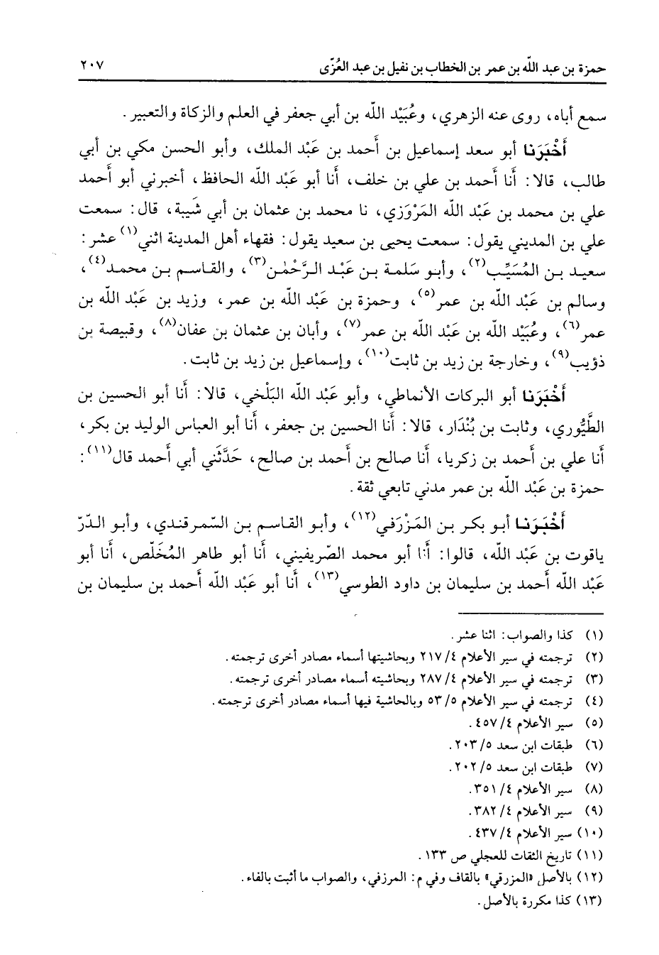 سمع أباه روى عنه الزهري وعبيد الله بن أبي جعفر في العلم والزكاة والتعبير أخبرنا أبو سعد إسماعيل بن أحمد بن عبد الملك وأبو الحسن مكي بن أبي طالب قالا أنا أحمد بن علي بن خلف أنا أبو عبد الله الحافظ أخبرني أبو أحمد علي بن محمد بن عبد الله المروزي نا محمد بن عثمان بن أبي شيبة قال سمعت علي بن المديني يقول سمعت يحيى بن سعيد يقول فقهاء أهل المدينة اثني (1) عشر سعيد بن المسيب (2) وأبو سلمة بن عبد الرحمن (3) والقاسم بن محمد (4) وسالم بن عبد الله بن عمر (5) وحمزة بن عبد الله بن عمر وزيد بن عبد الله بن عمر (6) وعبيد الله بن عبد الله بن عمر (7) وأبان بن عثمان بن عفان (8) وقبيصة بن ذؤيب (9) وخارجة بن زيد بن ثابت (10) وإسماعيل بن زيد بن ثابت أخبرنا أبو البركات الأنماطي وأبو عبد الله البلخي قالا أنا أبو الحسين بن الطيوري وثابت بن بندار قالا أنا الحسين بن جعفر أنا أبو العباس الوليد بن بكر أنا علي بن أحمد بن زكريا أنا صالح بن أحمد بن صالح حدثني أبي أحمد قال (11) حمزة بن عبد الله بن عمر مدني تابعي ثقة أخبرنا أبو بكر بن المزرفي (12) وأبو القاسم بن السمرقندي وأبو الدر ياقوت بن عبد الله قالوا أنا أبو محمد الصريفيني أنا أبو طاهر المخلص أنا أبو عبد الله أحمد بن سليمان بن داود الطوسي (13) أنا أبو عبد الله أحمد بن سليمان بن