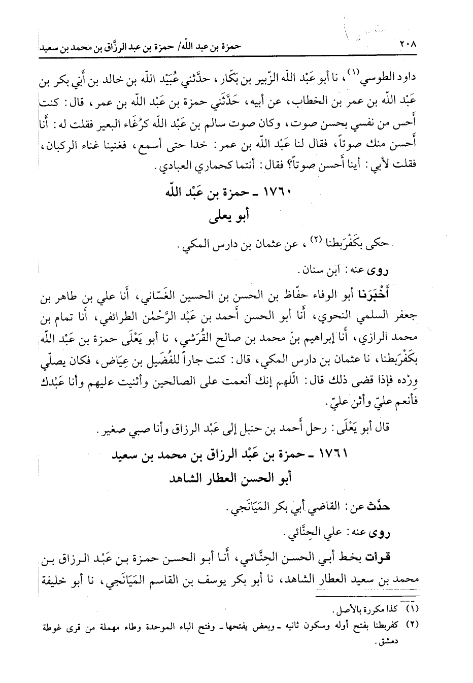 1760 - حمزة بن عبد الله أبو يعلى حكى بكفربطنا (2) عن عثمان بن دارس المكي روى عنه ابن سنان أخبرنا أبو الوفاء حفاظ بن الحسن بن الحسين الغساني أنا علي بن طاهر بن جعفر السلمي النحوي أنا أبو الحسن أحمد بن عبد الرحمن الطرائفي أنا تمام بن محمد الرازي أنا إبراهيم بن محمد بن صالح القرشي نا أبو يعلى حمزة بن عبد الله بكفربطنا نا عثمان بن دارس المكي قال كنت جارا للفضيل بن عياض فكان يصلي ورده فإذا قضى ذلك قال اللهم إنك أنعمت على الصالحين وأثنيت عليهم وأنا عبدك فأنعم علي وأثن علي قال أبو يعلى رحل أحمد بن حنبل إلى عبد الرزاق وأنا صبي صغير