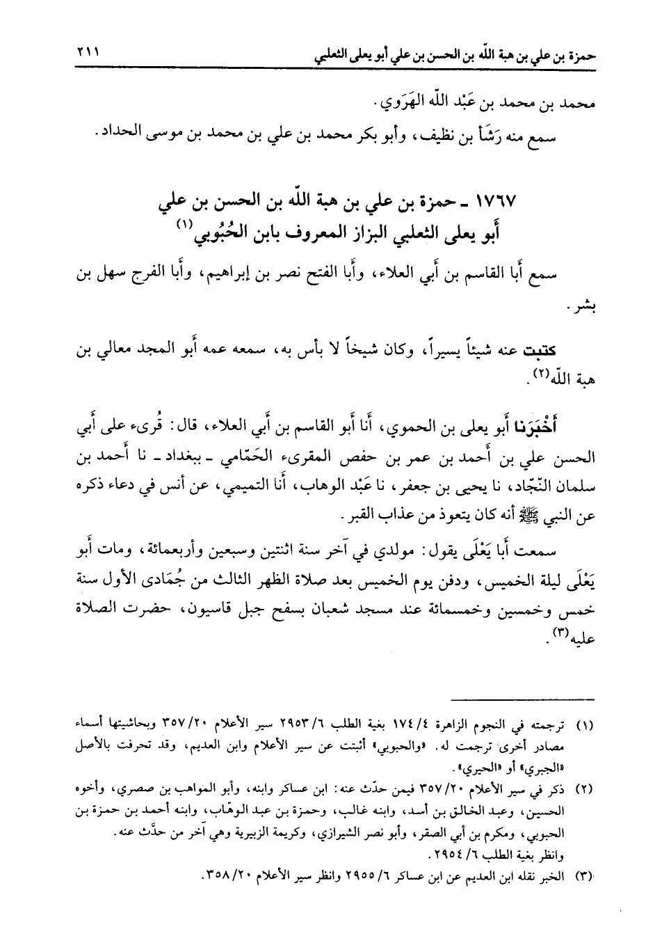 1767 - حمزة بن علي بن هبة الله بن الحسن بن علي أبو يعلى الثعلبي البزاز المعروف بابن الحبوبي (1) سمع أبا القاسم بن أبي العلاء وأبا الفتح نصر بن إبراهيم وأبا الفرج سهل بن بشر كتبت عنه شيئا يسيرا وكان شيخا لا بأس به سمعه عمه أبو المجد معالي بن هبة الله (2) أخبرنا أبو يعلى بن الحموي أنا أبو القاسم بن أبي العلاء قال قرئ على أبي الحسن علي بن أحمد بن عمر بن حفص المقرئ الحمامي ببغداد نا أحمد بن سلمان النجاد نا يحيى بن جعفر نا عبد الوهاب أنا التميمي عن أنس في دعاء ذكره عن النبي (صلى الله عليه وسلم) أنه كان يتعوذ من عذاب القبر سمعت أبا يعلى يقول مولدي في آخر سنة اثنتين وسبعين وأربعمائة ومات أبو يعلى ليلة الخميس ودفن يوم الخميس بعد صلاة الظهر الثالث من جمادى الأول سنة خمس وخمسين وخمسمائة عند مسجد شعبان بسفح جبل قاسيون حضرت الصلاة عليه (3)
