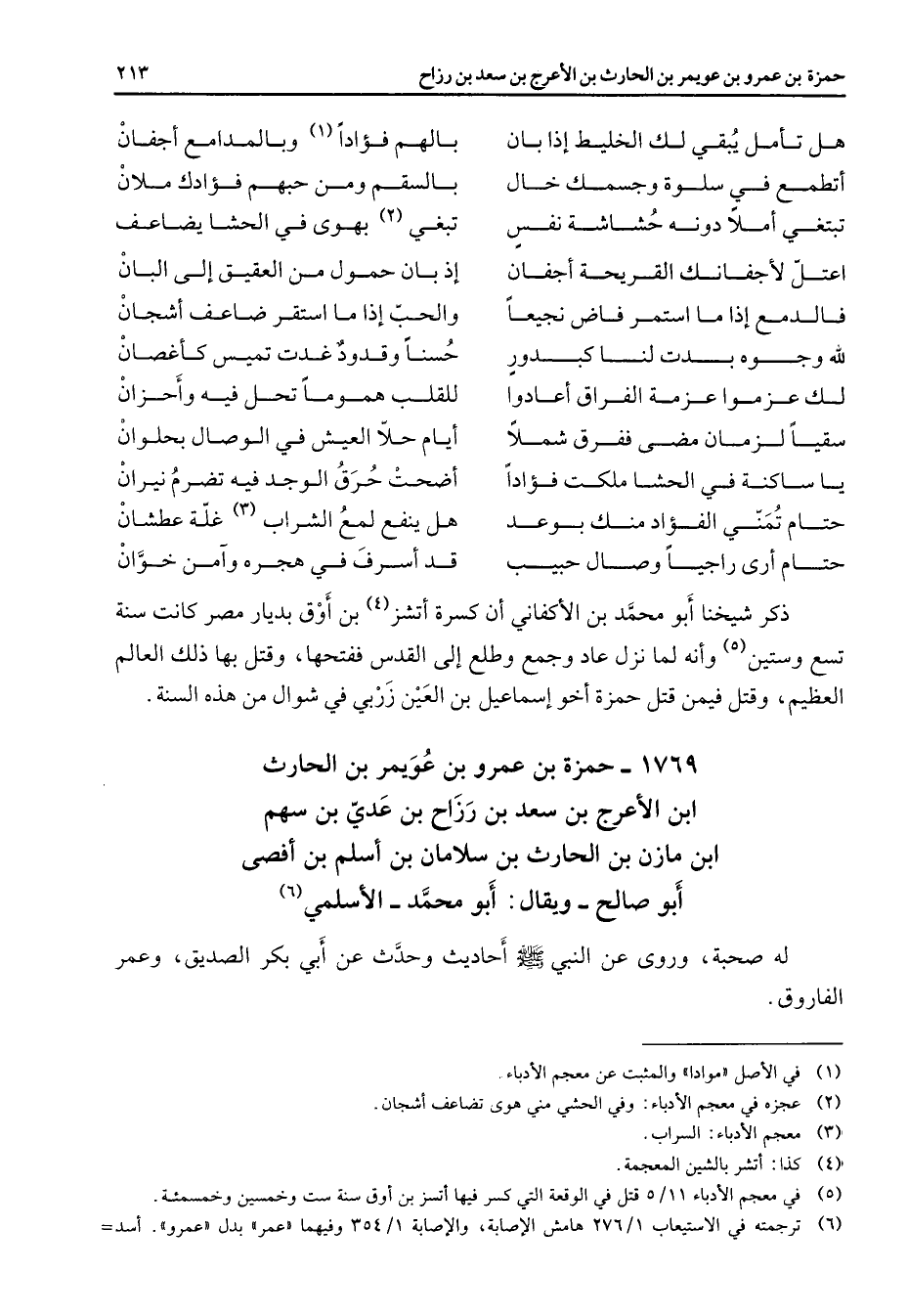 * هل تأمل يبقي لك الخليط إذا بان * بالهم فؤادا (1) وبالمدامع أجفان أتطمع في سلوة وجسمك خال * بالسقم ومن حبهم فؤادك ملان تبتغي (2) أملا دونه حشاشة نفس * تبغي بهوى في الحشا يضاعف اعتل لأجفانك القريحة أجفان * إذ بان حمول من العقيق إلى البان فالدمع إذا ما استمر فاض نجيعا * والحب إذا ما استقر ضاعف أشجان لله وجوه بدت لنا كبدور * حسنا وقدود غدت تميس كأغصان لك عزموا عزمة الفراق أعادوا * للقلب هموما تحل فيه وأحزان سقيا لزمان مضى ففرق شملا * أيام حلا العيش في الوصال بحلوان يا ساكنة في الحشا ملكت فؤادا * أضحت حرق الوجد فيه تضرم نيران حتام تمني الفؤاد منك بوعد * هل ينفع لمع الشراب (3) غلة عطشان حتام أرى راجيا وصال حبيب * قد أسرف في هجره وآمن خوان * ذكر شيخنا أبو محمد بن الأكفاني أن كسرة أتشز (4) بن أوق بديار مصر كانت سنة تسع وستين (5) وأنه لما نزل عاد وجمع وطلع إلى القدس ففتحها وقتل بها ذلك العالم العظيم وقتل فيمن قتل حمزة أخو إسماعيل بن العين زربي في شوال من هذه السنة