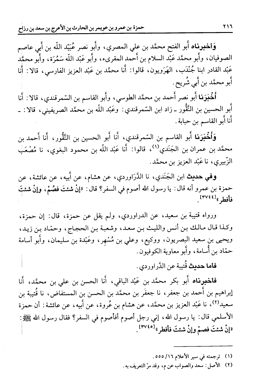 وأخبرناه أبو الفتح محمد بن علي المصري وأبو نصر عبيد الله بن أبي عاصم الصوفيان وأبو محمد عبد السلام بن أحمد المقرئ وأبو عبد الله سمرة وأبو محمد عبد القادر ابنا جندب الهرويون قالوا أنا محمد بن عبد العزيز الفارسي قالا أنا أبو محمد بن أبي شريح أخبرنا أبو نصر أحمد بن محمد الطوسي وأبو القاسم بن السمرقندي قالا أنا أبو الحسين بن النقور زاد ابن السمرقندي وعبد الله بن محمد الصريفيني قالا أنا أبو القاسم بن حبابة وأخبرنا أبو القاسم بن السمرقندي أنا أبو الحسين بن النقور أنا أحمد بن محمد بن عمران بن الجندي (1) قالوا أنا عبد الله بن محمود البغوي نا مصعب الزبيري نا عبد العزيز بن محمد وفي حديث ابن الجندي نا الدراوردي عن هشام عن أبيه عن عائشة عن حمزة بن عمرو أنه قال يا رسول الله أصوم في السفر قال إن شئت فصم وإن شئت فأفطر (3744) ورواه قتيبة بن سعيد عن الدراوردي ولم يقل عن حمزة قال إن حمزة وكذا قال مالك بن أنس والليث بن سعد وشعبة بن الحجاج وحماد بن زيد ويحيى بن سعيد البصريون ووكيع وعلي بن مسهر وعبدة بن سليمان وأبو أسامة حماد بن أسامة وأبو معاوية الكوفيون فأما حديث قتيبة عن الدراوردي فأخبرناه أبو بكر محمد بن عبد الباقي أنا الحسن بن علي بن محمد أنا إبراهيم بن أحمد بن جعفر نا جعفر بن محمد بن الحسن بن المستفاض نا قتيبة بن سعيد (2) نا عبد العزيز بن محمد عن هشام بن عروة عن أبيه عن عائشة أن حمزة الأسلمي قال يا رسول الله إني رجل أصوم أفأصوم في السفر فقال رسول الله (صلى الله عليه وسلم) إن شئت فصم وإن شئت فأفطر (3745)