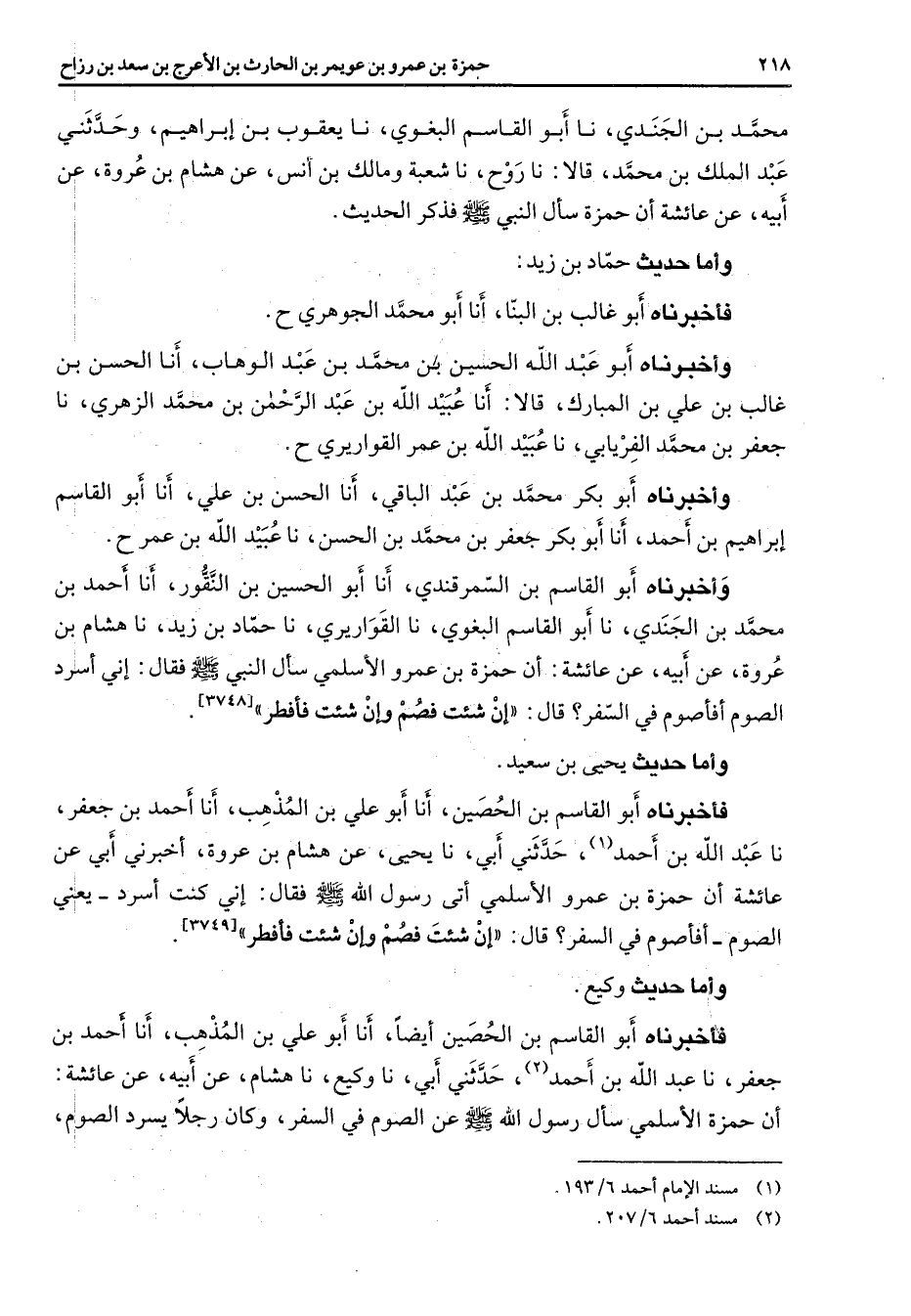 محمد بن الجندي نا أبو القاسم البغوي نا يعقوب بن إبراهيم وحدثني عبد الملك بن بن محمد قالا نا روح نا شعبة ومالك بن أنس عن هشام بن عروة عن أبيه عن عائشة أن حمزة سأل النبي (صلى الله عليه وسلم) فذكر الحديث وأما حديث حماد بن زيد فأخبرناه أبو غالب بن البنا أنا أبو محمد الجوهري ح وأخبرناه أبو عبد الله الحسين بن محمد بن عبد الوهاب أنا الحسن بن غالب بن علي بن المبارك قالا أنا عبيد الله بن عبد الرحمن بن محمد الزهري نا جعفر بن محمد الفريابي نا عبيد الله بن عمر القواريري ح وأخبرناه أبو بكر محمد بن عبد الباقي أنا الحسن بن علي أنا أبو القاسم إبراهيم بن أحمد أنا أبو بكر جعفر بن محمد بن الحسن نا عبيد الله بن عمر ح وأخبرناه أبو القاسم بن السمرقندي أنا أبو الحسين بن النقور أنا أحمد بن محمد بن الجندي نا أبو القاسم البغوي نا القواريري نا حماد بن زيد نا هشام بن عروة عن أبيه عن عائشة أن حمزة بن عمرو الأسلمي سأل النبي (صلى الله عليه وسلم) فقال إن أسرد الصوم أفأصوم في السفر قال إن شئت فصم وإن شئت فأفطر (3748) وأما حديث يحيى بن سعيد فأخبرناه أبو القاسم بن الحصين أنا أبو علي بن المذهب أنا أحمد بن جعفر نا عبد الله بن أحمد حدثني أبي نا يحيى عن هشام بن عروة أخبرني أبي عن عائشة أن حمزة بن عمرو الأسلمي أتى رسول الله (صلى الله عليه وسلم) فقال إني كنت أسرد يعني الصوم أفأصوم في السفر قال إن شئت فصم وإن شئت فأفطر (3749) وأما حديث وكيع فأخبرناه أبو القاسم بن الحصين أيضا أنا أبو علي بن المذهب أنا أحمد بن جعفر نا عبد الله بن أحمد (2) حدثني أبي نا وكيع نا هشام عن أبيه عن عائشة أن حمزة الأسلمي سأل رسول الله (صلى الله عليه وسلم) عن الصوم في السفر وكان رجلا يسرد الصوم