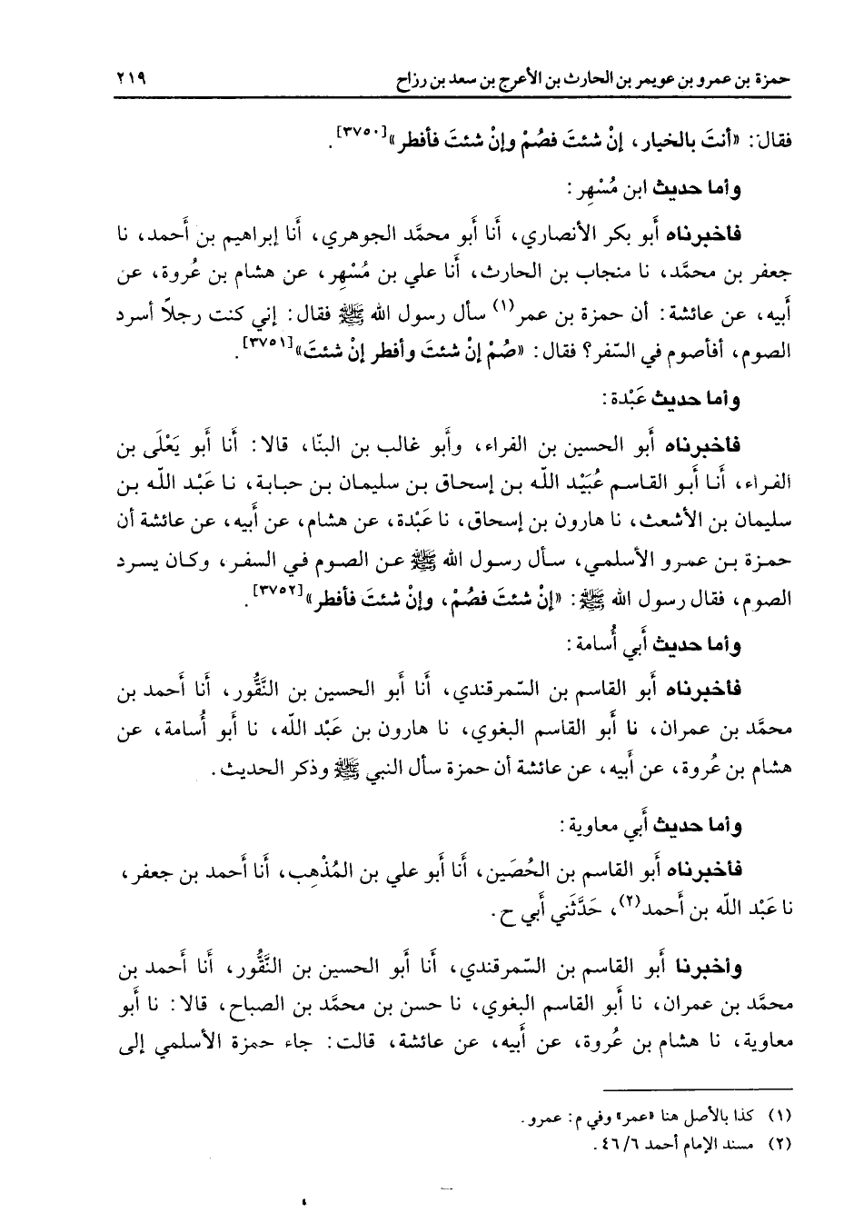 فقال أنت بالخيار إن شئت فصم وإن شئت فأفطر (3750) وأما حديث ابن مسهر فأخبرناه أبو بكر الأنصاري أنا أبو محمد الجوهري أنا إبراهيم بن أحمد نا جعفر بن محمد نا منجاب بن الحارث أنا علي بن مسهر عن هشام بن عروة عن أبيه عن عائشة أن حمزة بن عمر (1) سأل رسول الله (صلى الله عليه وسلم) فقال إني كنت رجلا أسرد الصوم أفأصوم في السفر فقال صم إن شئت وأفطر إن شئت (3751) وأما حديث عبدة فأخبرناه أبو الحسين بن الفراء وأبو غالب بن البنا قالا أنا أبو يعلى بن الفراء أنا أبو القاسم عبيد الله بن إسحاق بن سليمان بن حبابة نا عبد الله بن سليمان بن الأشعث نا هارون بن إسحاق نا عبدة عن هشام عن أبيه عن عائشة أن حمزة بن عمرو الأسلمي سأل رسول الله (صلى الله عليه وسلم) عن الصوم في السفر وكان يسرد الصوم فقال رسول الله (صلى الله عليه وسلم) إن شئت فصم وإن شئت فأفطر (3752) وأما حديث أبي أسامة فأخبرناه أبو القاسم بن السمرقندي أنا أبو الحسين بن النقور أنا أحمد بن محمد بن عمران نا أبو القاسم البغوي نا هارون بن عبد الله نا أبو أسامة عن هشام بن عروة عن أبيه عن عائشة أن حمزة سأل النبي (صلى الله عليه وسلم) وذكر الحديث وأما حديث أبي معاوية فأخبرناه أبو القاسم بن الحصين أنا أبو علي بن المذهب أنا أحمد بن جعفر نا عبد الله بن أحمد (2) حدثني أبي ح وأخبرنا أبو القاسم بن السمرقندي أنا أبو الحسين بن النقور أنا أحمد بن محمد بن عمران نا أبو القاسم البغوي نا حسن بن محمد بن الصباح قالا نا أبو معاوية نا هشام بن عروة عن أبيه عن عائشة قالت جاء حمزة الأسلمي إلى
