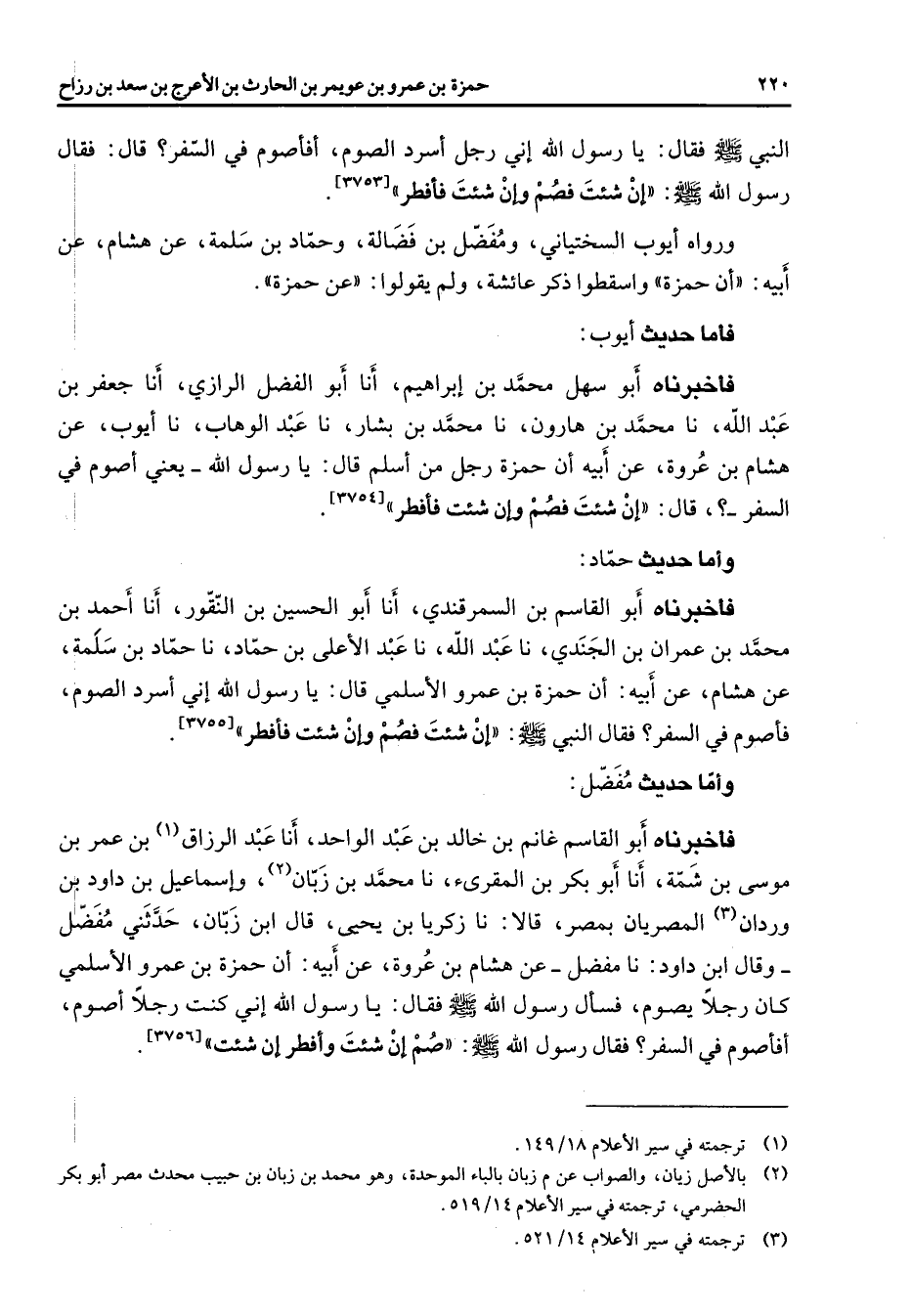 النبي (صلى الله عليه وسلم) فقال يا رسول الله إني رجل أسرد الصوم أفأصوم في السفر قال فقال رسول الله (صلى الله عليه وسلم) إن شئت فصم وإن شئت فأفطر (3753) ورواه أيوب السختياني ومفضل بن فضالة وحماد بن سلمة عن هشام عن أبيه أن حمزة واسقطوا ذكر عائشة ولم يقولوا عن حمزة فأما حديث أيوب فأخبرناه أبو سهل محمد بن إبراهيم أنا أبو الفضل الرازي أنا جعفر بن عبد الله نا محمد بن هارون نا محمد بن بشار نا عبد الوهاب نا أيوب عن هشام بن عروة عن أبيه أن حمزة رجل من أسلم قال يا رسول الله يعني أصوم في السفر قال إن شئت فصم وإن شئت فأفطر (3754) وأما حديث حماد فأخبرناه أبو القاسم بن السمرقندي أنا أبو الحسين بن النقور أنا أحمد بن محمد بن عمران بن الجندي نا عبد الله نا عبد الأعلى بن حماد نا حماد بن سلمة عن هشام عن أبيه أن حمزة بن عمرو الأسلمي قال يا رسول الله إني أسرد الصوم فأصوم في السفر فقال النبي (صلى الله عليه وسلم) إن شئت فصم وإن شئت فأفطر (3755) وأما حديث مفضل فأخبرناه أبو القاسم غانم بن خالد بن عبد الواحد أنا عبد الرزاق (1) بن عمر بن موسى بن شمة أنا أبو بكر بن المقرئ نا محمد بن زبان (2) وإسماعيل بن داود بن وردان (3) المصريان بمصر قالا نا زكريا بن يحيى قال ابن زبان حدثني مفضل وقال ابن داود نا مفضل عن هشام بن عروة عن أبيه أن حمزة بن عمرو الأسلمي كان رجلا يصوم فسأل رسول الله (صلى الله عليه وسلم) فقال يا رسول الله إني كنت رجلا أصوم أفأصوم في السفر فقال رسول الله (صلى الله عليه وسلم) صم إن شئت وأفطر إن شئت (3756)