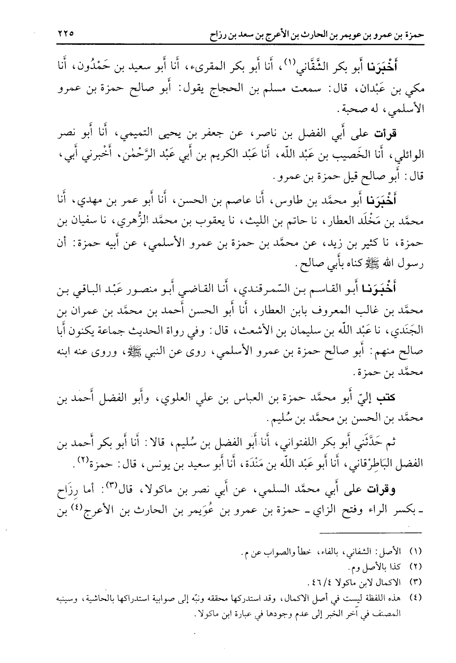 أخبرنا أبو بكر الشقاني (1) أنا أبو بكر المقرئ أنا أبو سعيد بن حمدون أنا مكي بن عبدان قال سمعت مسلم بن الحجاج يقول أبو صالح حمزة بن عمرو الأسلمي له صحبة قرأت على أبي الفضل بن ناصر عن جعفر بن يحيى التميمي أنا أبو نصر الوائلي أنا الخصيب بن عبد الله أنا عبد الكريم بن أبي عبد الرحمن أخبرني أبي قال أبو صالح قيل حمزة بن عمرو أخبرنا أبو محمد بن طاوس أنا عاصم بن الحسن أنا أبو عمر بن مهدي أنا محمد بن مخلد العطار نا حاتم بن الليث نا يعقوب بن محمد الزهري نا سفيان بن حمزة نا كثير بن زيد عن محمد بن حمزة بن عمرو الأسلمي عن أبيه حمزة أن رسول الله (صلى الله عليه وسلم) كناه بأبي صالح أخبرنا أبو القاسم بن السمرقندي أنا القاضي أبو منصور عبد الباقي بن محمد بن غالب المعروف بابن العطار أنا أبو الحسن أحمد بن محمد بن عمران بن الجندي نا عبد الله بن سليمان بن الأشعث قال وفي رواة الحديث جماعة يكنون أبا صالح منهم أبو صالح حمزة بن عمرو الأسلمي روى عن النبي (صلى الله عليه وسلم) وروى عنه ابنه محمد بن حمزة كتب إلي أبو محمد حمزة بن العباس بن علي العلوي وأبو الفضل أحمد بن محمد بن الحسن بن محمد بن سليم ثم حدثني أبو بكر اللفتواني أنا أبو الفضل بن سليم قالا أنا أبو بكر أحمد بن الفضل الباطرقاني أنا أبو عبد الله بن مندة أنا أبو سعيد بن يونس قال حمزة (2) وقرأت على أبي محمد السلمي عن أبي نصر بن ماكولا قال (3) أما رزاح بكسر الراء وفتح الزاي حمزة بن عمرو بن عويمر بن الحارث بن الأعرج (4) بن