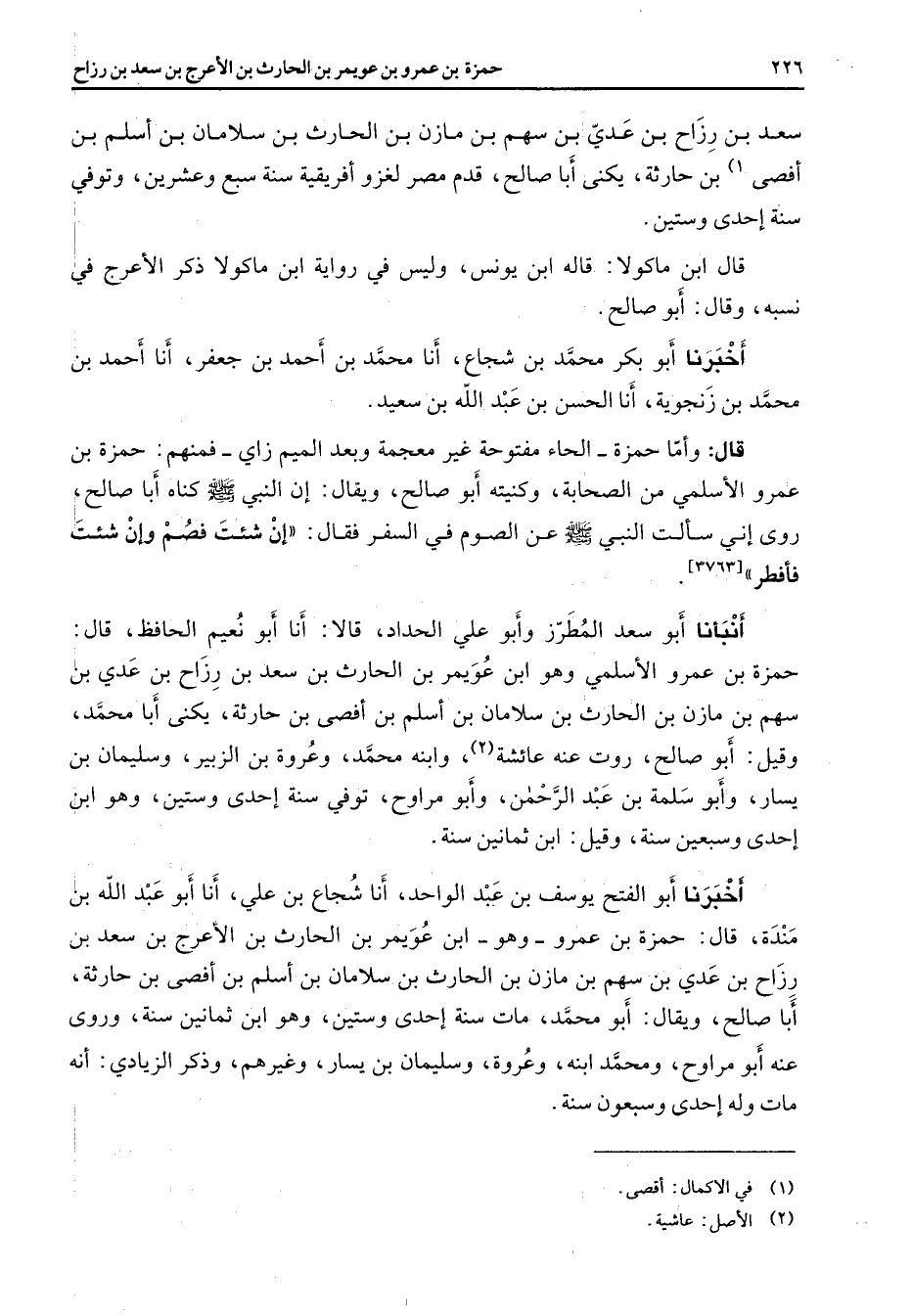 سعد بن رزاح بن عدي بن سهم بن مازن بن الحارث بن سلامان بن أسلم بن أفصى (1) بن حارثة يكنى أبا صالح قدم مصر لغزو أفريقية سنة سبع وعشرين وتوفي سنة إحدى وستين قال ابن ماكولا قاله ابن يونس وليس في رواية ابن ماكولا ذكر الأعرج في نسبه وقال أبو صالح أخبرنا أبو بكر محمد بن شجاع أنا محمد بن أحمد بن جعفر أنا أحمد بن محمد بن زنجوية أنا الحسن بن عبد الله بن سعيد قال وأما حمزة الحاء مفتوحة غير معجمة وبعد الميم زاي فمنهم حمزة بن عمرو الأسلمي من الصحابة وكنيته أبو صالح ويقال إن النبي (صلى الله عليه وسلم) كناه أبا صالح روى إني سألت النبي (صلى الله عليه وسلم) عن الصوم في السفر فقال إن شئت فصم وإن شئت فأفطر (3763) أنبأنا أبو سعد المطرز وأبو علي الحداد قالا أنا أبو نعيم الحافظ قال حمزة بن عمرو الأسلمي وهو ابن عويمر بن الحارث بن سعد بن رزاح بن عدي بن سهم بن مازن بن الحارث بن سلامان بن أسلم بن أفصى بن حارثة يكنى أبا محمد وقيل أبو صالح روت عنه عائشة (2) وابنه محمد وعروة بن الزبير وسليمان بن يسار وأبو سلمة بن عبد الرحمن وأبو مراوح توفي سنة إحدى وستين وهو ابن إحدى وسبعين سنة وقيل ابن ثمانين سنة أخبرنا أبو الفتح يوسف بن عبد الواحد أنا شجاع بن علي أنا أبو عبد الله بن مندة قال حمزة بن عمرو وهو ابن عويمر بن الحارث بن الأعرج بن سعد بن رزاح بن عدي بن سهم بن مازن بن الحارث بن سلامان بن أسلم بن أفصى بن حارثة أبا صالح ويقال أبو محمد مات سنة إحدى وستين وهو ابن ثمانين سنة وروى عنه أبو مراوح ومحمد ابنه وعروة وسليمان بن يسار وغيرهم وذكر الزيادي أنه مات وله إحدى وسبعون سنة