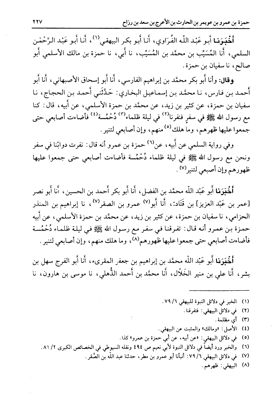 أخبرنا أبو عبد الله الفراوي أنا أبو بكر البيهقي (1) أنا أبو عبد الرحمن السلمي أنا المسيب بن محمد بن المسيب نا أبي نا حمزة بن مالك الأسلمي أبو صالح نا سفيان بن حمزة وقال وأنا أبو بكر محمد بن إبراهيم الفارسي أنا أبو إسحاق الأصبهاني أنا أبو أحمد بن فارس نا محمد بن إسماعيل البخاري حدثني أحمد بن الحجاج نا سفيان بن حمزة عن كثير بن زيد عن محمد بن حمزة الأسلمي عن أبيه قال كنا مع رسول الله (صلى الله عليه وسلم) في سفر فنفرنا (2) في ليلة ظلماء (3) دحمسة (4) فأضاءت أصابعي حتى جمعوا عليها ظهرهم وما هلك (5) منهم وإن أصابعي لتنير وفي رواية السلمي عن أبيه عن (6) حمزة بن عمرو أنه قال نفرت دوابنا في سفر ونحن مع رسول الله (صلى الله عليه وسلم) في ليلة ظلماء دحمسة فأضاءت أصابعي حتى جمعوا عليها ظهورهم وإن أصبعي لتنير (7) أخبرنا أبو عبد الله محمد بن الفضل أنا أبو بكر أحمد بن الحسين أنا أبو نصر عمر بن عبد العزيز بن قتادة أنا أبو (7) عمرو بن الصقر (7) نا إبراهيم بن المنذر الحزامي نا سفيان بن حمزة عن كثير بن زيد عن محمد بن حمزة الأسلمي عن أبيه حمزة بن عمرو أنه قال تفرقنا في سفر مع رسول الله (صلى الله عليه وسلم) في ليلة ظلماء دحمسة فأضاءت أصابعي حتى جمعوا عليها ظهورهم (8) وما هلك منهم وإن أصابعي لتنير أخبرنا أبو عبد الله محمد بن إبراهيم بن جعفر المقرئ أنا أبو الفرج سهل بن بشر أنا علي بن منير الخلال أنا محمد بن أحمد الذهلي نا موسى بن هارون نا