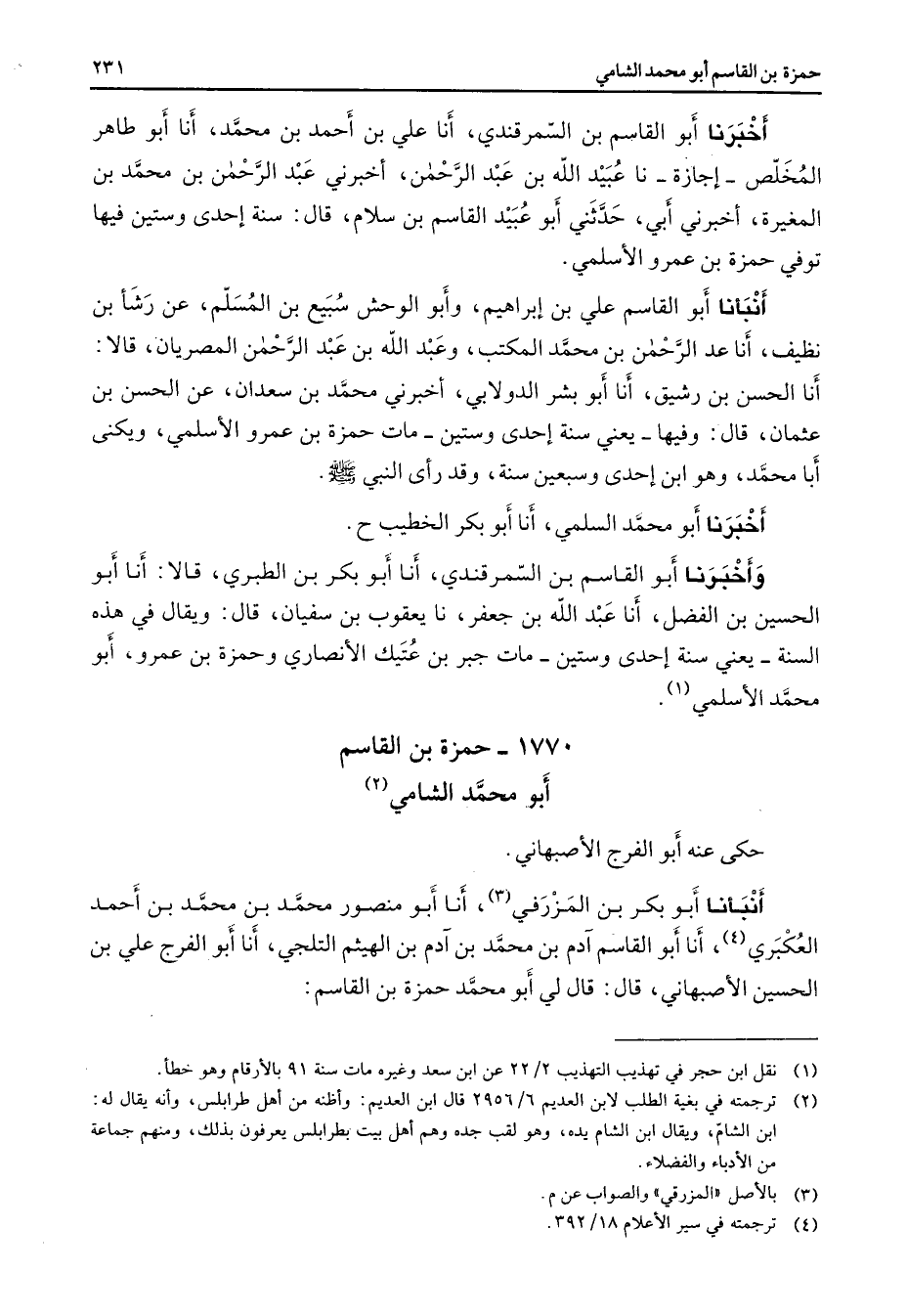 1770 - حمزة بن القاسم أبو محمد الشامي (2) حكى عنه أبو الفرج الأصبهاني أنبأنا أبو بكر بن المزرفي (3) أنا أبو منصور محمد بن محمد بن أحمد العكبري (4) أنا أبو القاسم آدم بن محمد بن آدم بن الهيثم التلجي أنا أبو الفرج علي بن الحسين الأصبهاني قال قال لي أبو محمد حمزة بن القاسم