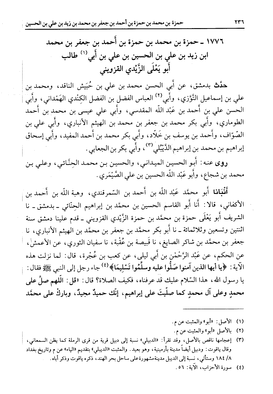 1776 - حمزة بن محمد بن حمزة بن أحمد بن جعفر بن محمد ابن زيد بن علي بن الحسين بن علي بن أبي (1) طالب أبو يعلى الزيدي القزويني حدث بدمشق عن أبي الحسن محمد بن علي بن حبيش الناقد ومحمد بن علي بن إسماعيل التوزي وأبي (2) العباس الفضل بن الفضل الكندي الهمداني وأبي الحسن علي بن أحمد بن عبد الله المقدسي وأبي علي عيسى بن محمد بن أحمد الطوماري وأبي بكر محمد بن جعفر بن محمد بن الهيثم الأنباري وأبي علي بن الصواف وأحمد بن يوسف بن خلاد وأبي بكر محمد بن أحمد المفيد وأبي إسحاق إبراهيم بن محمد بن إبراهيم الديبلي (3) وأبي بكر بن الجعابي روى عنه أبو الحسين الميداني والحسين بن محمد الحنائي وعلي بن محمد بن شجاع وأبو عبد الله الحسين بن علي الصيمري أنبأنا أبو محمد عبد الله بن أحمد بن السمرقندي وهبة الله بن أحمد بن الأكفاني قالا أنا أبو القاسم الحسين بن محمد بن إبراهيم الحنائي بدمشق نا الشريف أبو يعلى حمزة بن محمد بن حمزة الزيدي القزويني قدم علينا دمشق سنة اثنتين وتسعين وثلاثمائة نا أبو بكر محمد بن جعفر بن محمد بن الهيثم الأنباري نا جعفر بن محمد بن شاكر الصايغ نا قبيصة بن عقبة نا سفيان الثوري عن الأعمش عن الحكم عن عبد الرحمن بن أبي ليلى عن كعب بن عجرة قال لما نزلت هذه الآية " يا أيها الذين آمنوا صلوا عليه وسلموا تسليما " (4) جاء رجل إلى النبي (صلى الله عليه وسلم) فقال يا رسول الله هذا السلام عليك قد عرفناه فكيف الصلاة قال قل اللهم صل على محمد وعلى آل محمد كما صليت على إبراهيم إنك حميد مجيد وبارك على محمد