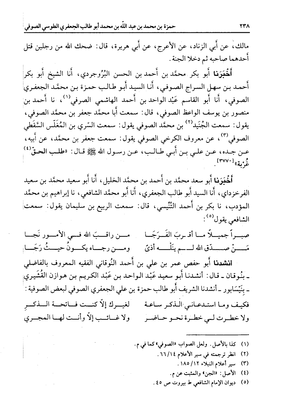 مالك عن أبي الزناد عن الأعرج عن أبي هريرة قال ضحك الله من رجلين قتل أحدهما صاحبه ثم دخلا الجنة أخبرنا أبو بكر محمد بن أحمد بن الحسن البروجردي أنا الشيخ أبو بكر أحمد بن سهل السراج الصوفي أنا السيد أبو طالب حمزة بن محمد الجعفري الصوفي أنا أبو القاسم عبد الواحد بن أحمد الهاشمي الصرفي (1) نا أحمد بن منصور بن يوسف الواعظ الصوفي قال سمعت أبا محمد جعفر بن محمد الصوفي يقول سمعت الجنيد (2) بن محمد الصوفي يقول سمعت السري بن المغلس السقطي الصوفي (3) عن معروف الكرخي الصوفي يقول سمعت جعفر بن محمد عن أبيه عن جده عن علي بن أبي طالب عن رسول الله (صلى الله عليه وسلم) قال طلب الحق (4) غربة (3770) أخبرنا أبو سعد محمد بن أحمد بن محمد الخليل أنا أبو سعيد محمد بن سعيد الفرخرداي أنا السيد أبو طالب الجعفري أنا أبو محمد الشافعي نا إبراهيم بن محمد المؤدب نا بكر بن أحمد التنيسي قال سمعت الربيع بن سليمان يقول سمعت الشافعي يقول (5) * صبرا جميلا ما أقرب الفرجا * من راقب الله في الأمور نجا من صدق الله لم ينله أذى * ومن رجاه يكون حيث رجا * أنشدنا أبو حفص عمر بن علي بن أحمد النوقاني الفقيه المعروف بالفاضلي بنوقان قال أنشدنا أبو سعيد عبد الواحد بن عبد الكريم بن هوازن القشيري بنيسابور أنشدنا الشريف أبو طالب حمزة بن علي الجعفري الصوفي لبعض الصوفية * فكيف وما استدعاني الذكر ساعة * لغيرك إلا كنت فاتحة الذكر ولا خطرت لي خطرة نحو حاضر * ولا غائب إلا وأنت لها المجري